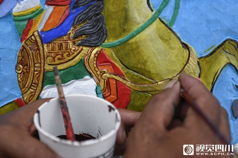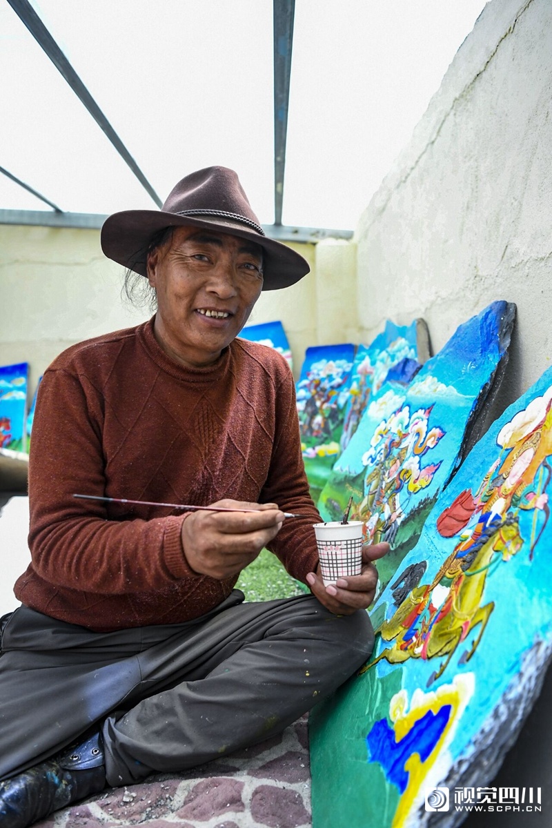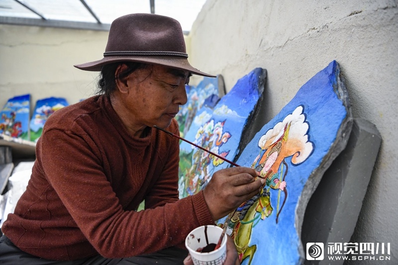 9月10日,甘孜州色达县色柯镇安康社区,牧民巴德正在制作格萨尔彩绘石刻。“这个石刻是客户订的,要赶着完成。”巴德今年59岁,是色达县康勒乡打西二村建档立卡贫困户,过去一家5口,居住在不足10平米阴暗简陋的土坯房里,过着“夏天漏雨水、冬天敞风雪”的日子,生活质量极低。“现在,我不仅住上了好房子,还过上了以前不敢想象的好日子。”巴德说。