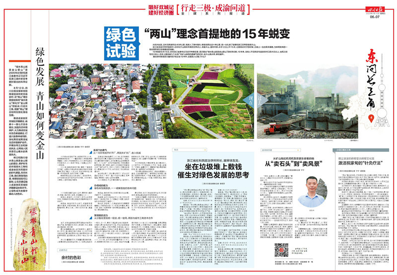 15年前,时任浙江省委书记习近平考察这里,首次提出“绿水青山就是金山银山”的科学论断。15年来,当地人不仅把这句话刻在村口的大石头上,也将之刻写在大地上:历史上曾经被几个水泥厂和矿山搞得乌烟瘴气的村庄,如今山清水秀,鲜花盛开。详文点击>>