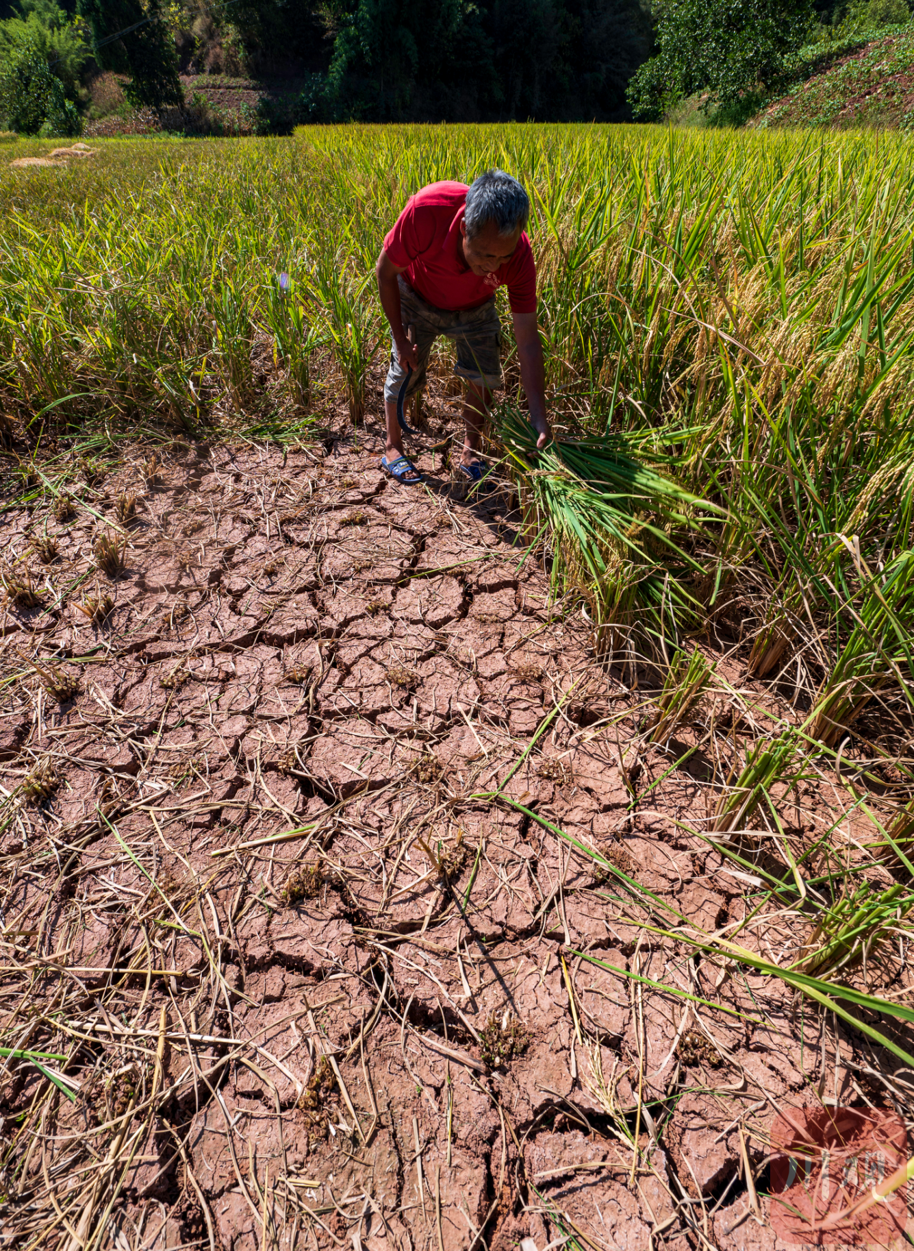 村里稻田出现缺水情况,村民积极抢收水稻。