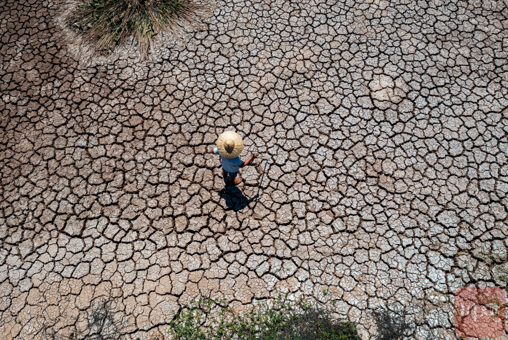 由于干旱少雨,村里养虾塘的水已经干涸。