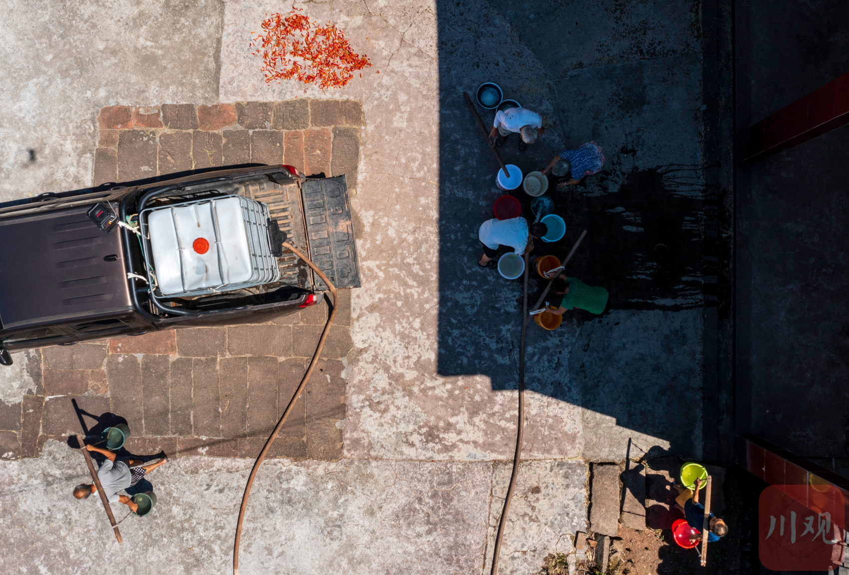 8月13日,清晨5点,泸州市纳溪区打古镇双家村室外的温度还接近30℃。睡了4个多小时的双家村村主任高德平起床来到井口,开始用抽水泵往皮卡车上的储水桶里注水,装满储水桶需要近2个小时,是4家人2天的生活用水。这样的工作状态他已经持续5天。已经有40多天没有明显降雨的双家村已经出现比较严重的旱情,村里不少田地已经出现龟裂,全村有100多户家庭出现人畜饮水困难。