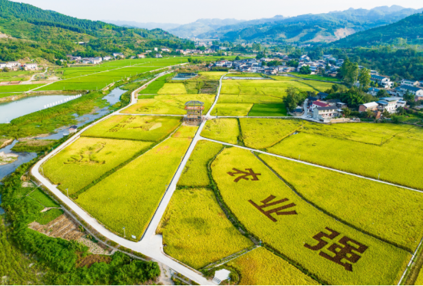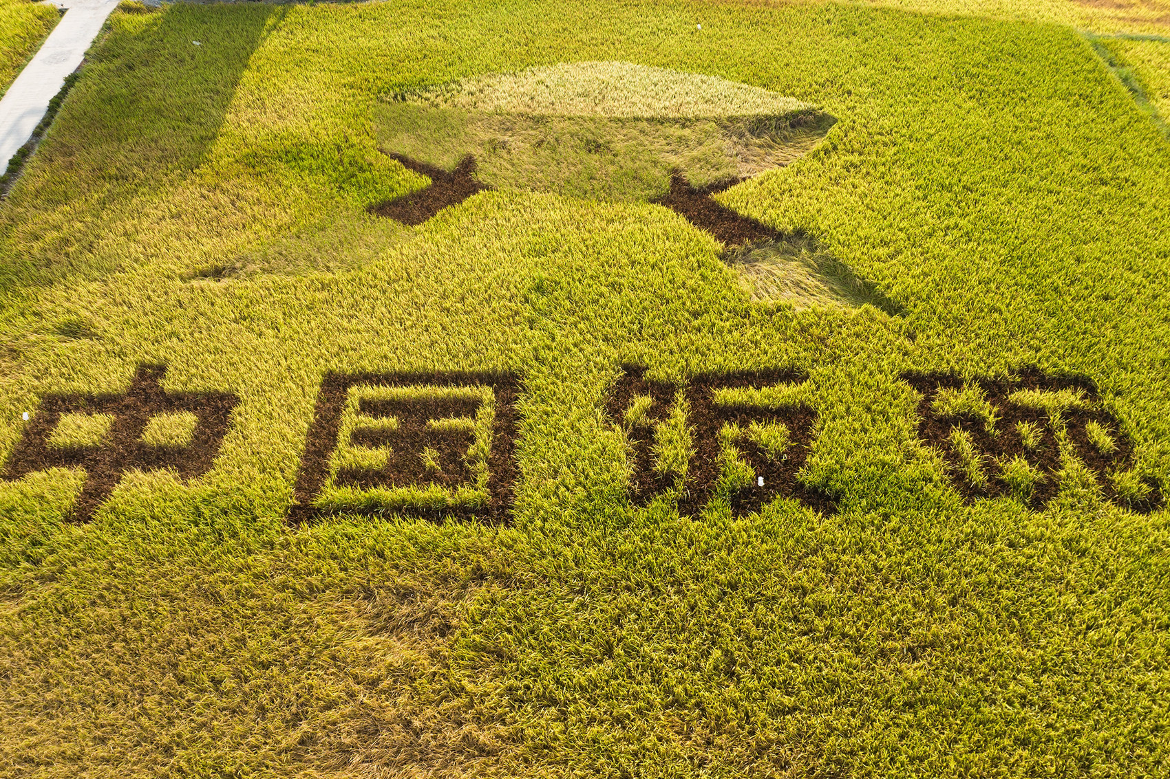 8月15日上午,内江威远县新场镇粮油现代农业园区迎来收割时刻。从空中俯瞰,以大地为纸,水稻为墨,与“农业强、农村美、农民富”“中国饭碗”等字样相互映衬,“农田彩绘”扮靓美丽乡村。沉甸甸的稻穗在阳光的照耀下闪着光芒,收割机在田间来回穿梭,一派繁忙景象。