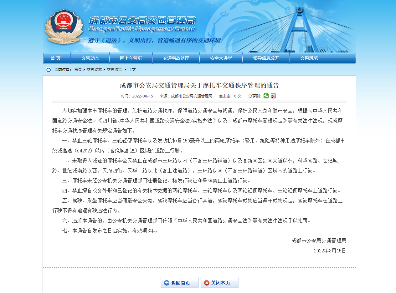 据悉,本次《成都市公安局交通管理局关于摩托车交通秩序管理的通告》自发布之日,即2022年8月15日起实施,有效期3年。