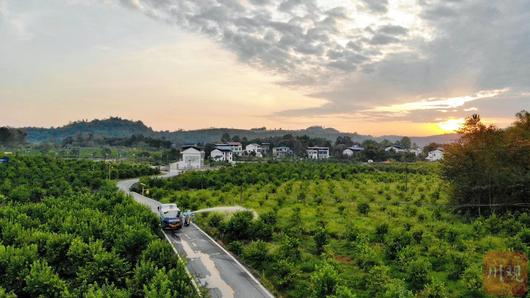 8月15日6时10分,太阳还未完全升起,广安市广安区气温已达32摄氏度。广安区大安镇司马村,一辆洒水车沿着一片柠檬地旁的公路缓缓行驶,清水从洒水车中喷出,最远喷射距离可达30米。