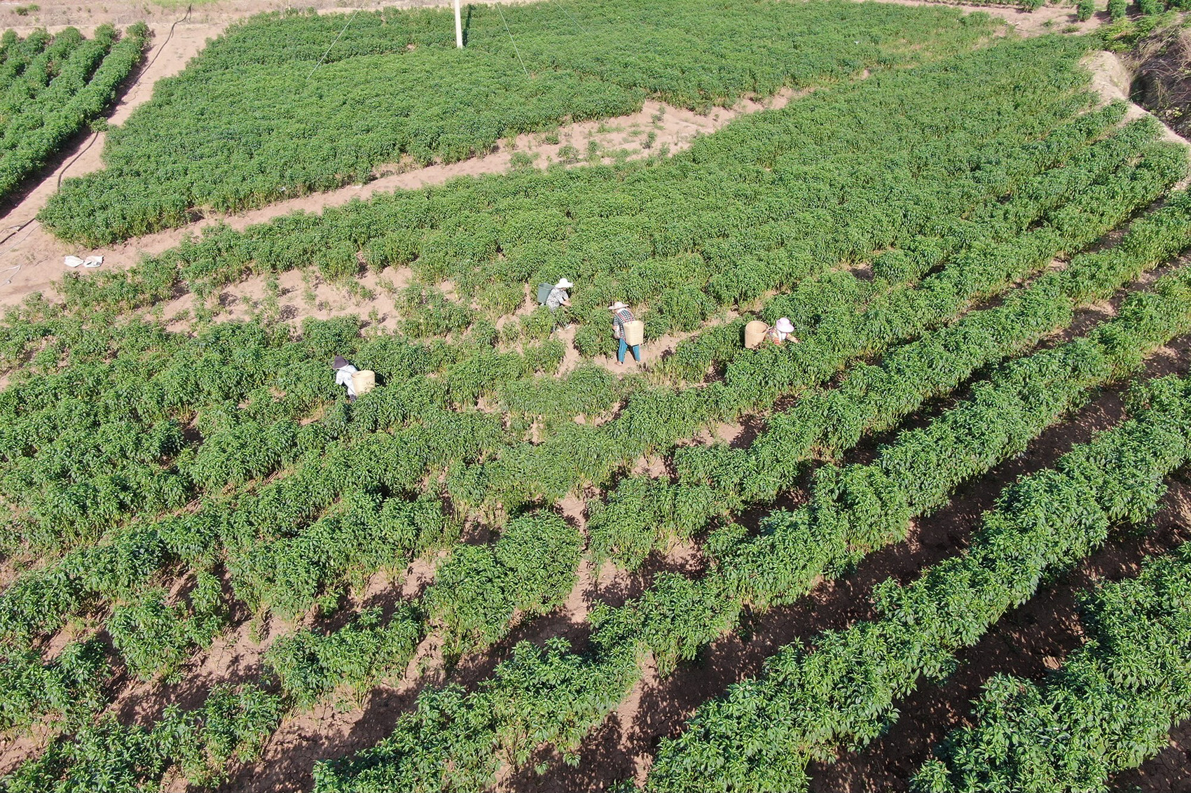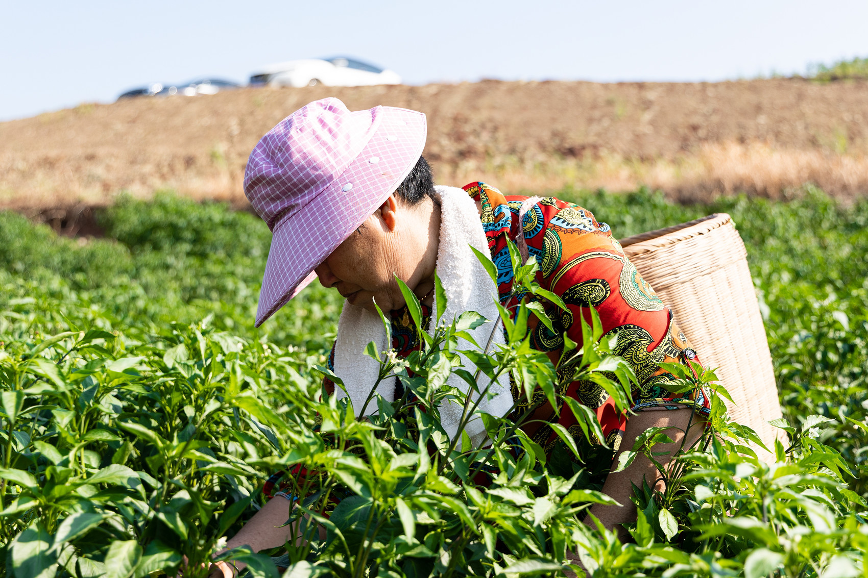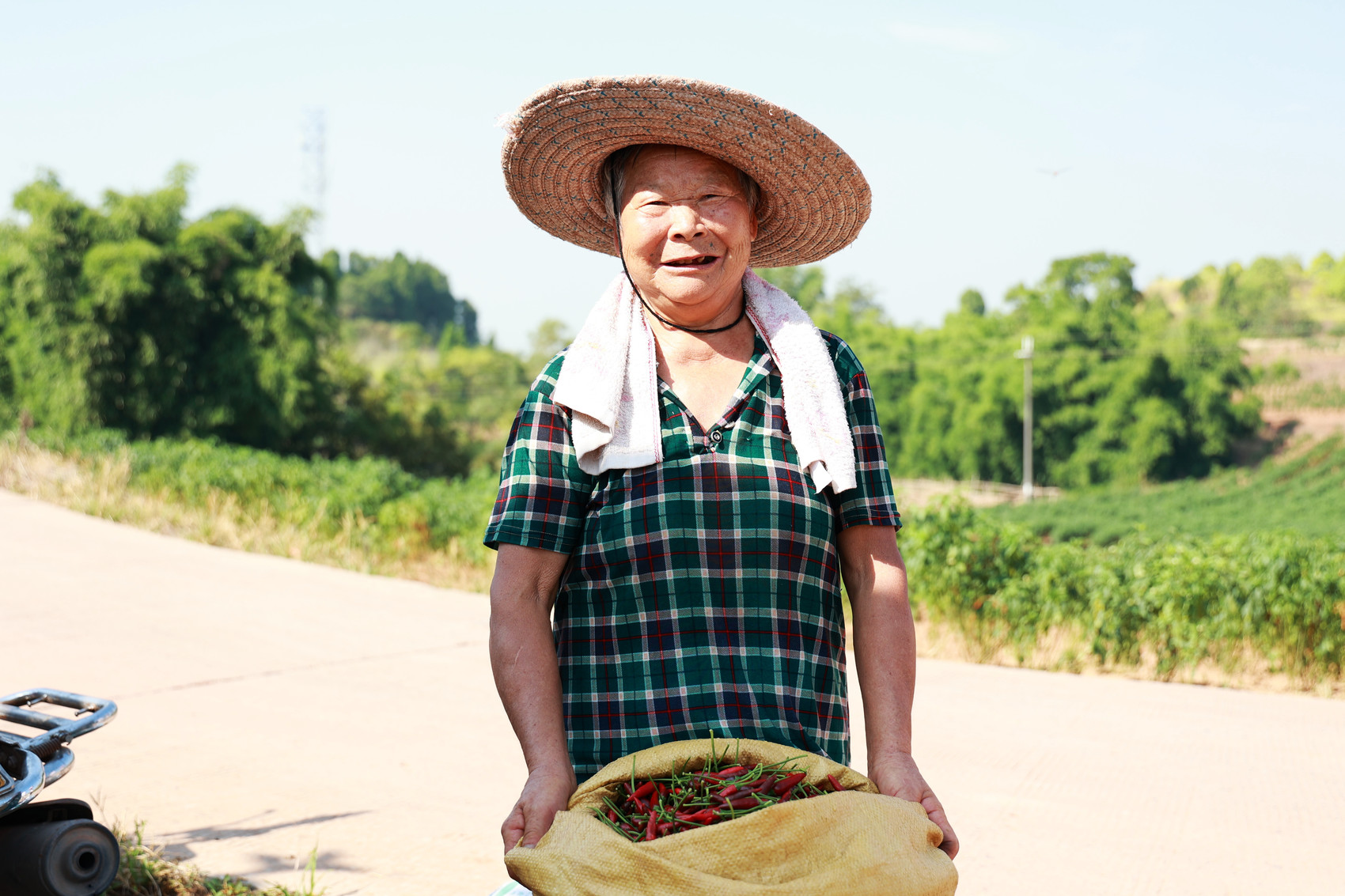 七星椒种植基地公路边上,民富村的村民刘桂真将自己刚刚采摘的七星椒,装进麻袋里。58岁的她,早上6点到10点来到地里采摘,“每两天采摘一次,没想到自己这么大年龄,还能通过七星椒,每个月收入两三千块钱。”刘桂真捧着一捧七星椒,弯腰扔进麻袋。