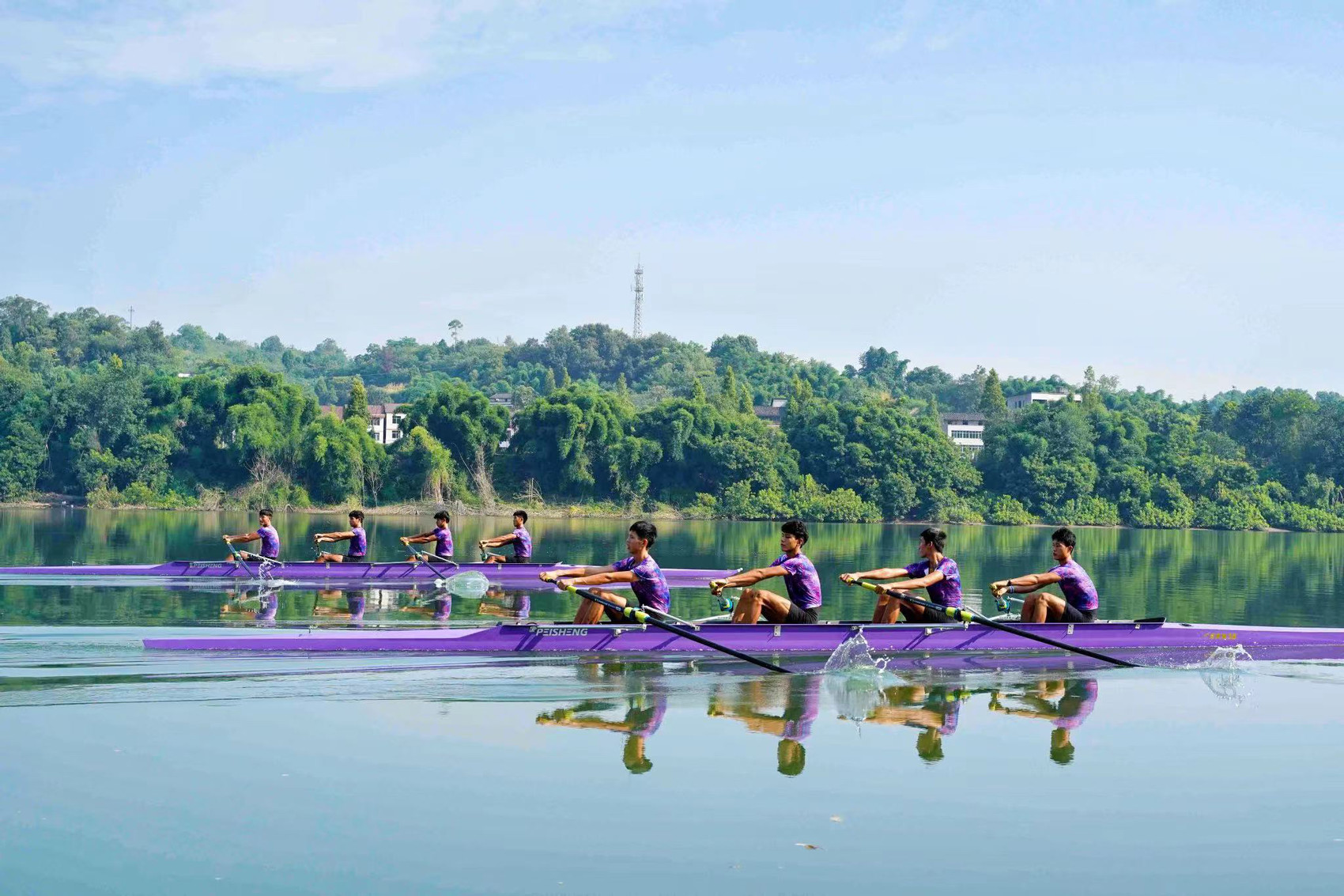 在第十四届省运会上取得佳绩的广安赛艇队队员在嘉陵江上进行训练。吴迪 摄
