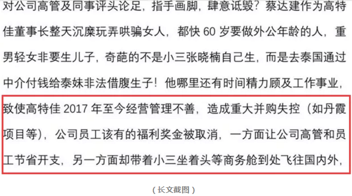 著名风投公司高特佳董事长创始人蔡达建结发妻子在网上发长文,举报蔡达建与秘书长期保持不正当关系,并声泪俱下地描述自己陪蔡达建白手起家开创事业的艰辛往事。值得关注的是,这篇长文表示,高特佳并购的丹霞项目出现重大问题,拖累到上市公司博雅生物。吓得一众股民一夜无眠!创投圈似乎一直不缺少各种八卦、狗血……但是如果涉及到上市公司、投资者,就不是“私人事情”了……日前,投资公司高特佳集团董事长蔡达建妻子金惠丽发表公开信,控诉董事长、高特佳控股股东蔡达建和其秘书存在长期不正当男女关系,且已经构成重婚行为。
