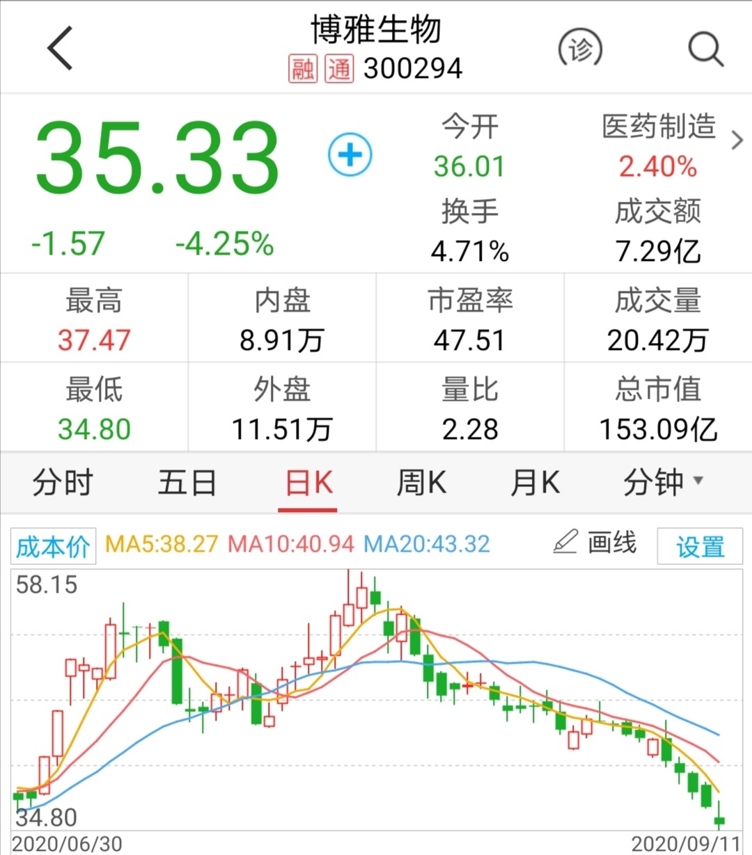 老司机都清楚,这两口子闹离婚分割财产时,肯定会涉及到上市公司股权分配。高特佳作为PE,投资公司后,实现了一定的投资收益就可能要完成退出。眼看投资博雅生物就要落袋为安了,结果出了这么一回事。不少网友认为,随着舆论闹大,可能会影响到接盘方的决定,同时亦会削弱高特佳卖博雅生物的议价能力。资本市场上,本来最近博雅生物股价就持续下挫,出了这么档事雪上加霜。截止9月11日收盘,股价跌4.25%。
