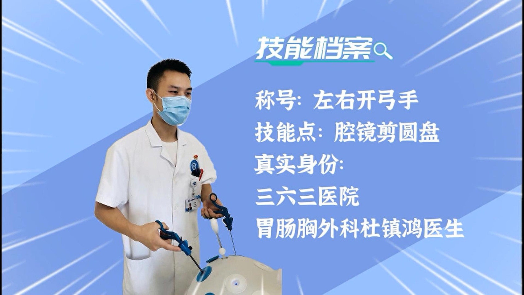 这对于一般人来讲可能比较困难,但是对于三六三医院胃肠胸外科杜镇鸿医生来说,这是他的训练日常——在腔镜下通过双手操作器具,将纸上的圆圈剪下来,操作难度在于如何在非常狭小的空间中协调手和眼睛。“剪圆盘”练习是为了提升操作器具的熟练度和手眼的协调能力,便于更好地完成腔镜游离组织间隙的手术(把脏器或组织从原来的附着处分离出来)。“剪圆盘”是外科医生常用的训练方法,也是实现独立完成腹腔镜手术的第一步。