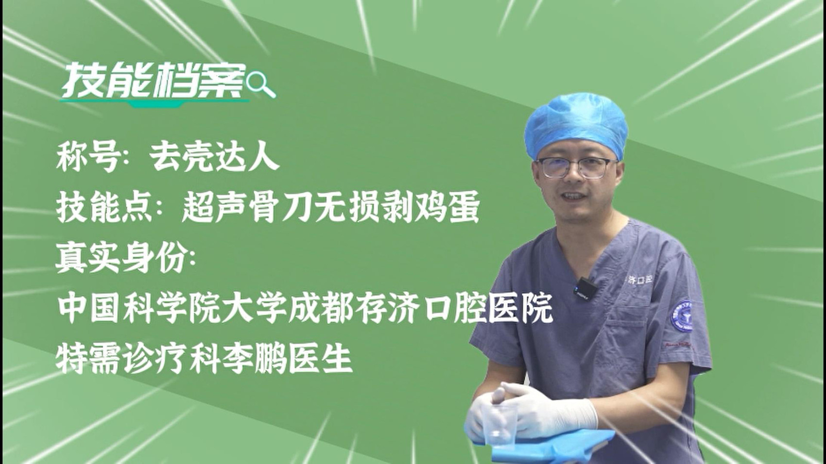 “剥得好生鸡蛋,才能做得好手术。”不禁有人要问了,剥生鸡蛋和手术有什么关系?中国科学院大学成都存济口腔医院特需诊疗科李鹏医生告知了答案:无损剥生鸡蛋是口腔医疗行业里的一个“技能点”,很多医生都用剥生鸡蛋来练手。