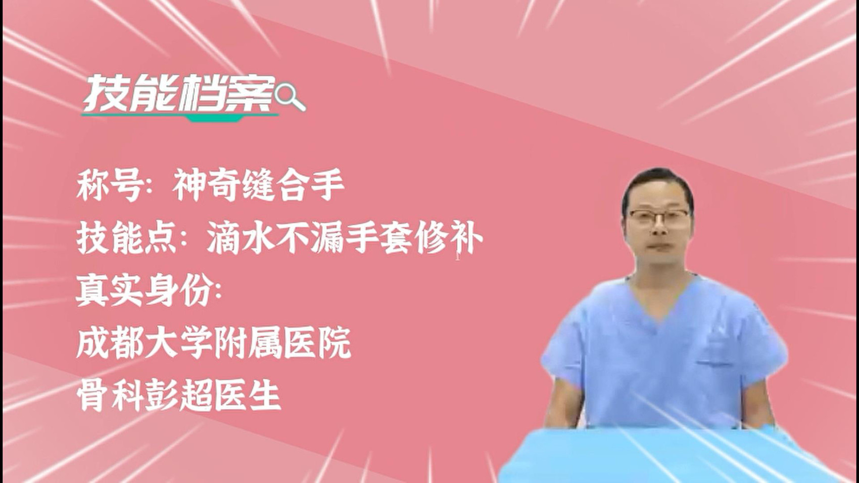 你知道吗?外科手术医生最开始也是从“一针一线”练习的。从事骨科脊柱专业10多年的成都大学附属医院骨科医生彭超在“缝补”方面也是“杠杠的”。