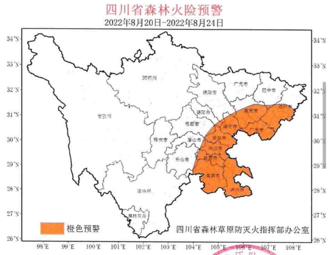 据气象部门预报,8月20日至24日盆地大部地方高温天气持续,最高气温西部沿山35—38°C,其余大部地方可达39—42°C或以上,盆地大部地区森林火险气象等级高(具体范围见附图)。据林草部门预报,8月20日至24日,上述地区森林火险等级为4级,局部可达5级。