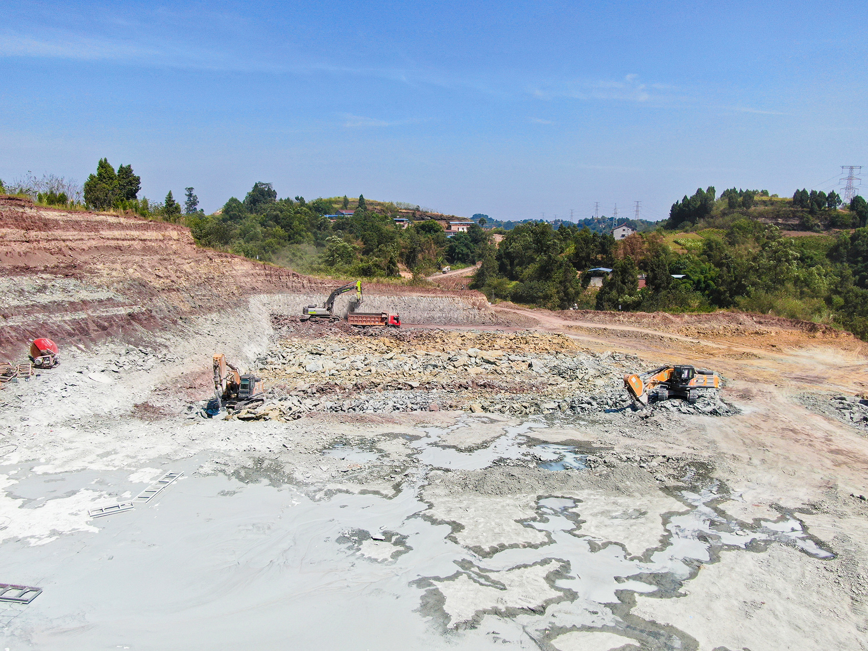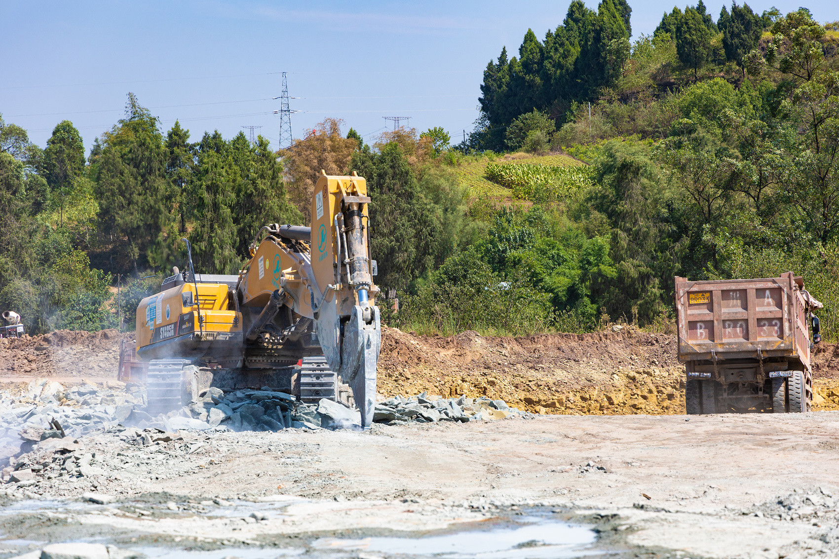 8月19日上午,成自高铁球溪站站前广场及基础设施建设项目施工现场,一台台挖掘机“用力”凿开地面,发出巨大的轰鸣声,10几辆运输车来回穿梭,运送着渣土。