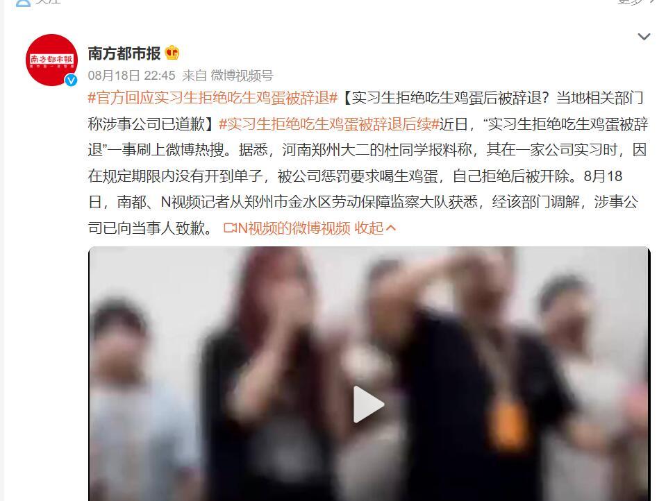 近日,“实习生拒绝吃生鸡蛋被辞退”一事刷上微博热搜。据媒体报道,河南省郑州市大二学生杜同学称,在一家公司实习时,被公司惩罚要求吃生鸡蛋,自己拒绝后被开除。该公司人事经理还称生吃鸡蛋是公司员工手册里注明的。8月18日,经过郑州市金水区劳动保障监察大队的调解,涉事公司已向当事人致歉。