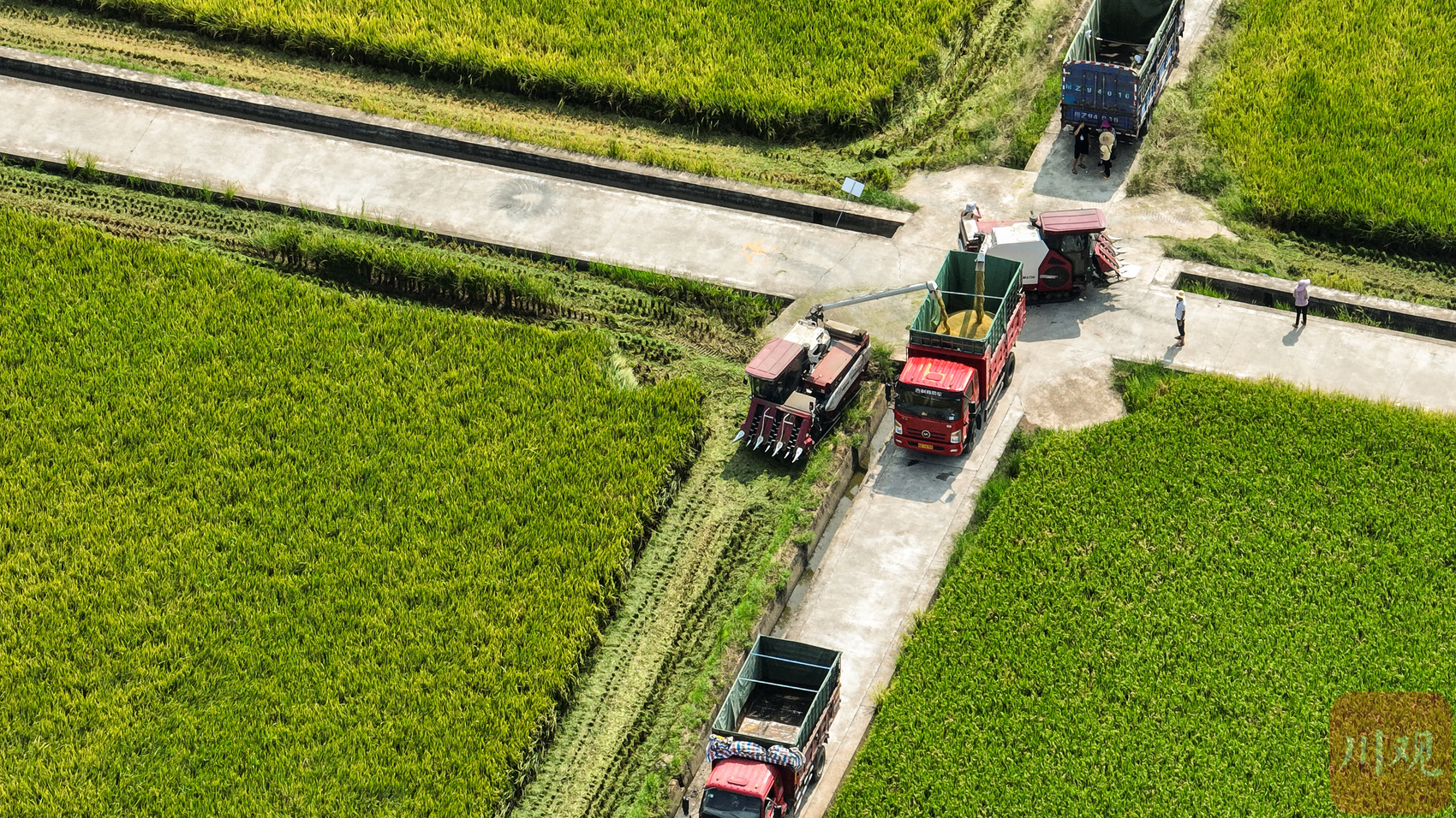 航拍视角看下去,绿色和黄色的方形农田整齐排列,收割机正在田间作业,收粮车在路边等待着第一波收获的稻谷进入车厢。