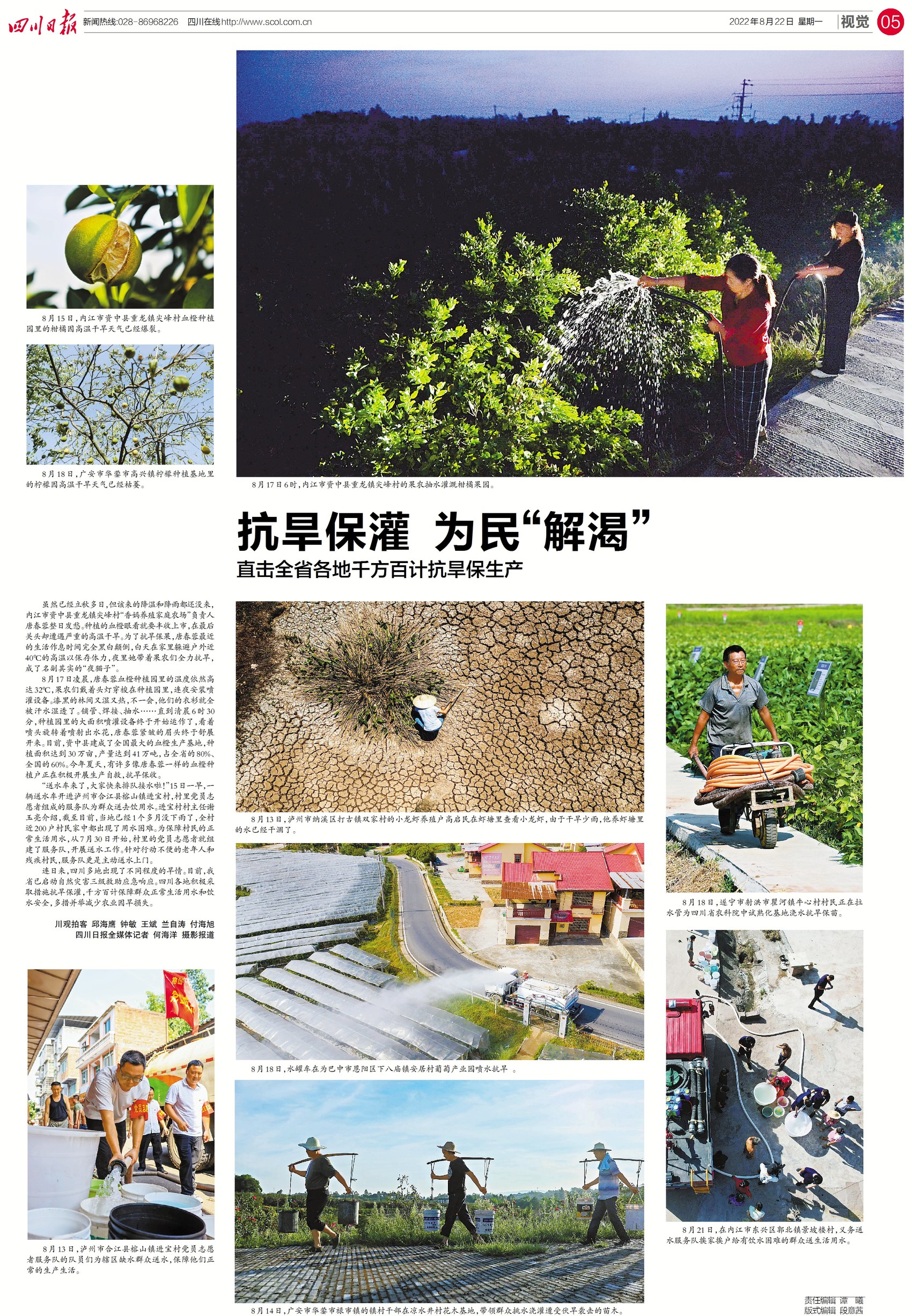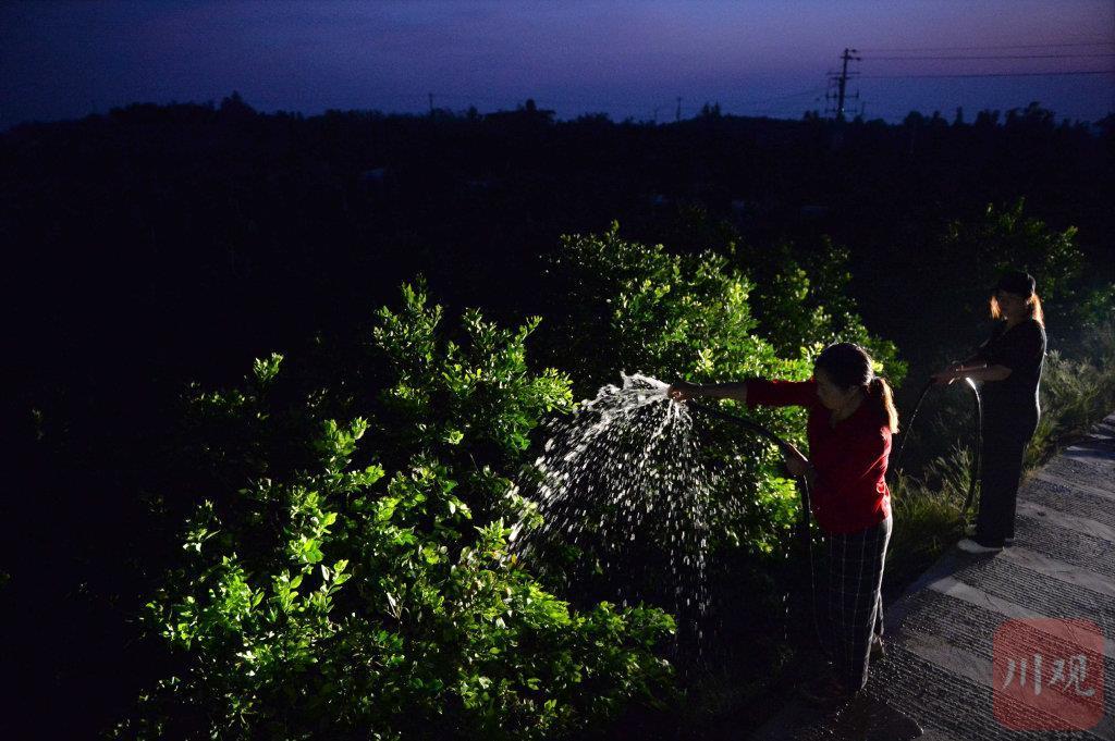 8月17日凌晨,唐春蓉血橙种植园里的温度依然高达32℃,果农们戴着头灯穿梭在种植园里,连夜安装喷灌设备。漆黑的林间又湿又热,不一会儿,他们的衣衫就全被汗水湿透了。铺管、焊接、抽水……直到清晨6时30分,种植园里的大面积喷灌设备终于开始运作了,看着喷头旋转着喷射出水花,唐春蓉紧皱的眉头终于舒展开来。目前,资中县建成了全国最大的血橙生产基地,种植面积达到30万亩,产量达到41万吨,占全省的80%、全国的60%。今年夏天,有许多像唐春蓉一样的血橙种植户正在积极开展生产自救,抗旱保收。
