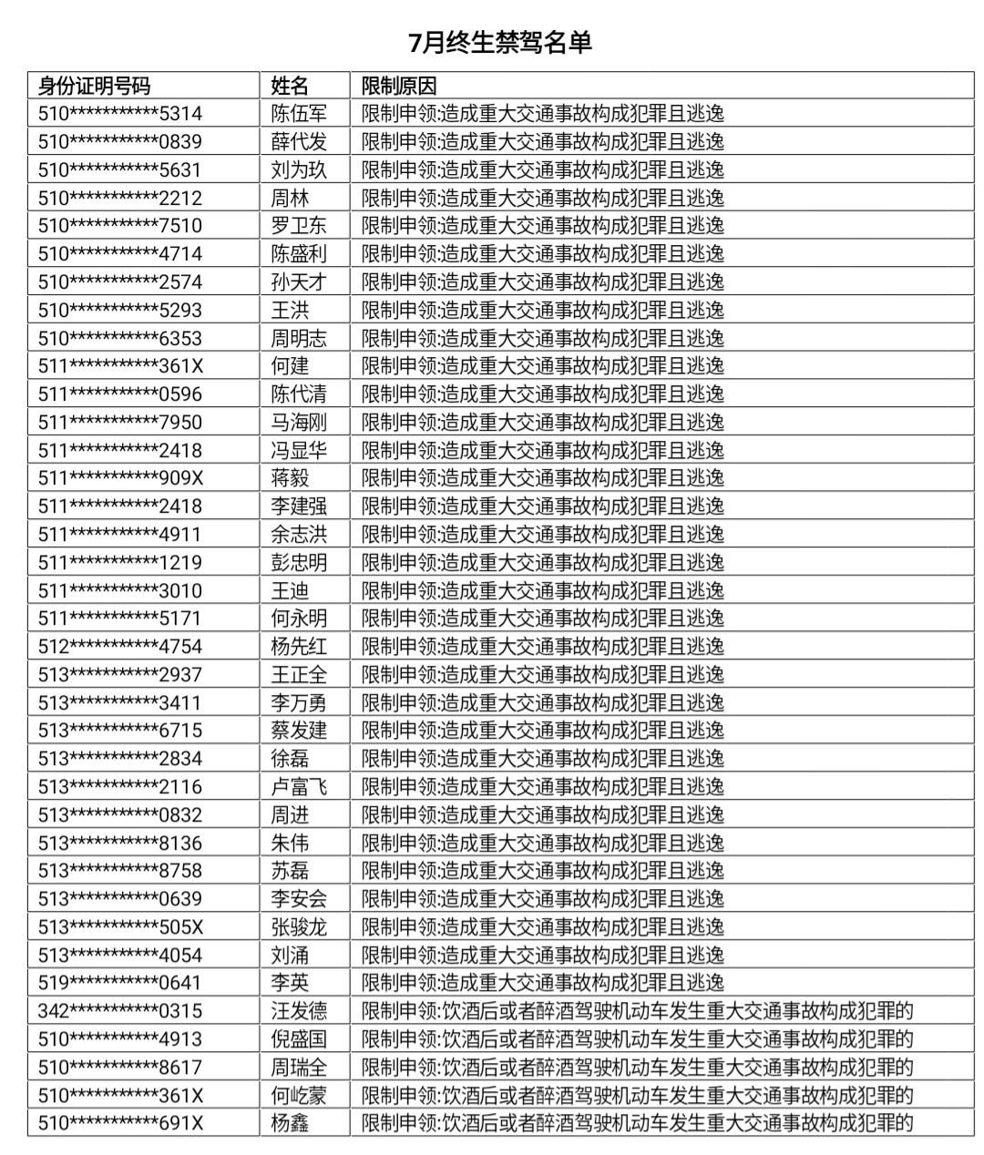 8月22日,四川省公安厅交通警察总队向社会集中曝光了2022年7月被终生禁驾的43名驾驶人名单,其中年龄最大的70岁,年龄最小的23岁。