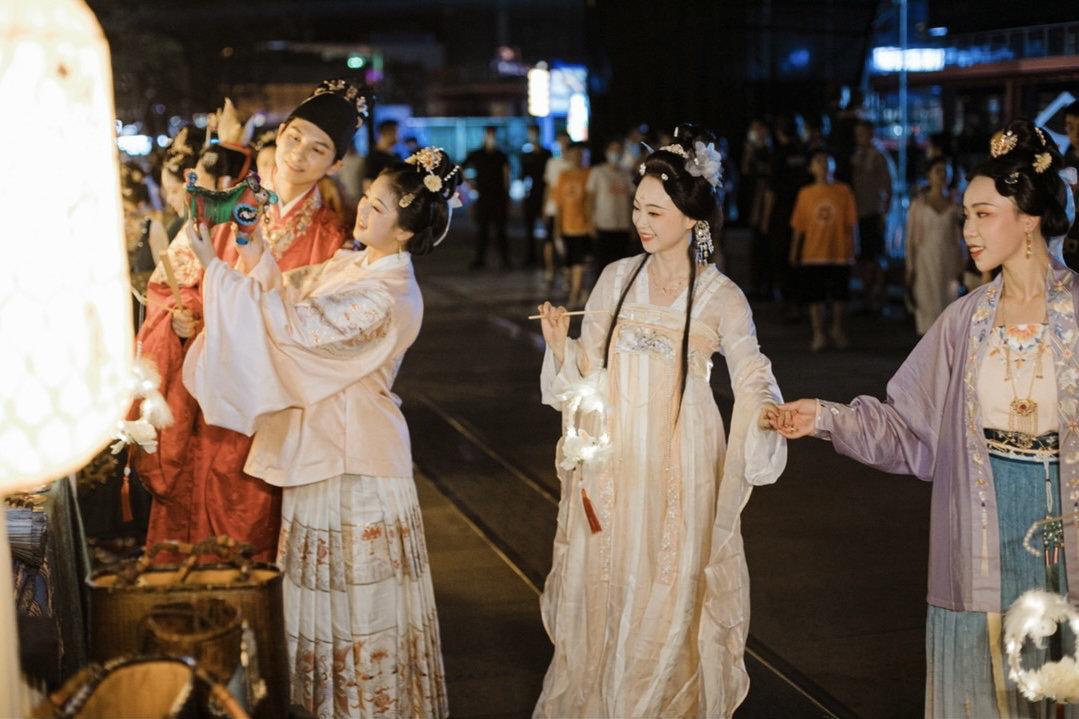 当晚进行的国风演出中,伴随悠扬琴声,一场汉服秀以“快闪”形式在交子大道上演,《礼仪之邦》汉服表演再现楚风汉韵,为游客们带来一场视觉盛宴。随即各项曲艺非遗项目陆续上演,承载着川人奇思与天才的川剧,用一幕变脸绝活惊艳众人;集文学、音乐、表演、打板于一体的四川车灯,以一首俏皮的《好吃嘴儿》带领大家回到七百年前的rap现场;一拍一击间变化无穷的四川竹琴,转腔换调,韵味悠长,好不热闹;群口相声《烟火成都》,通过编年史的方式讲述最市井的成都之声,演绎出了最亲切、最难以割舍的蓉城味道。