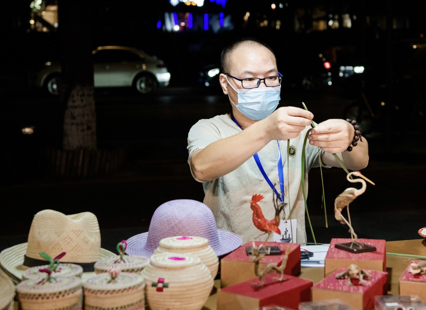 木艺、染织、皮制品、雕刻、国风饰品……晚上6时起,各种传统手工艺品在人来人往的交子大道上精致亮相。来自全国各地的手工商家带来各类匠心独具的精美展品,每项手艺都邀请相应匠人与游客进行现场互动,帮助深入了解物件背后的制作工艺及创作故事。