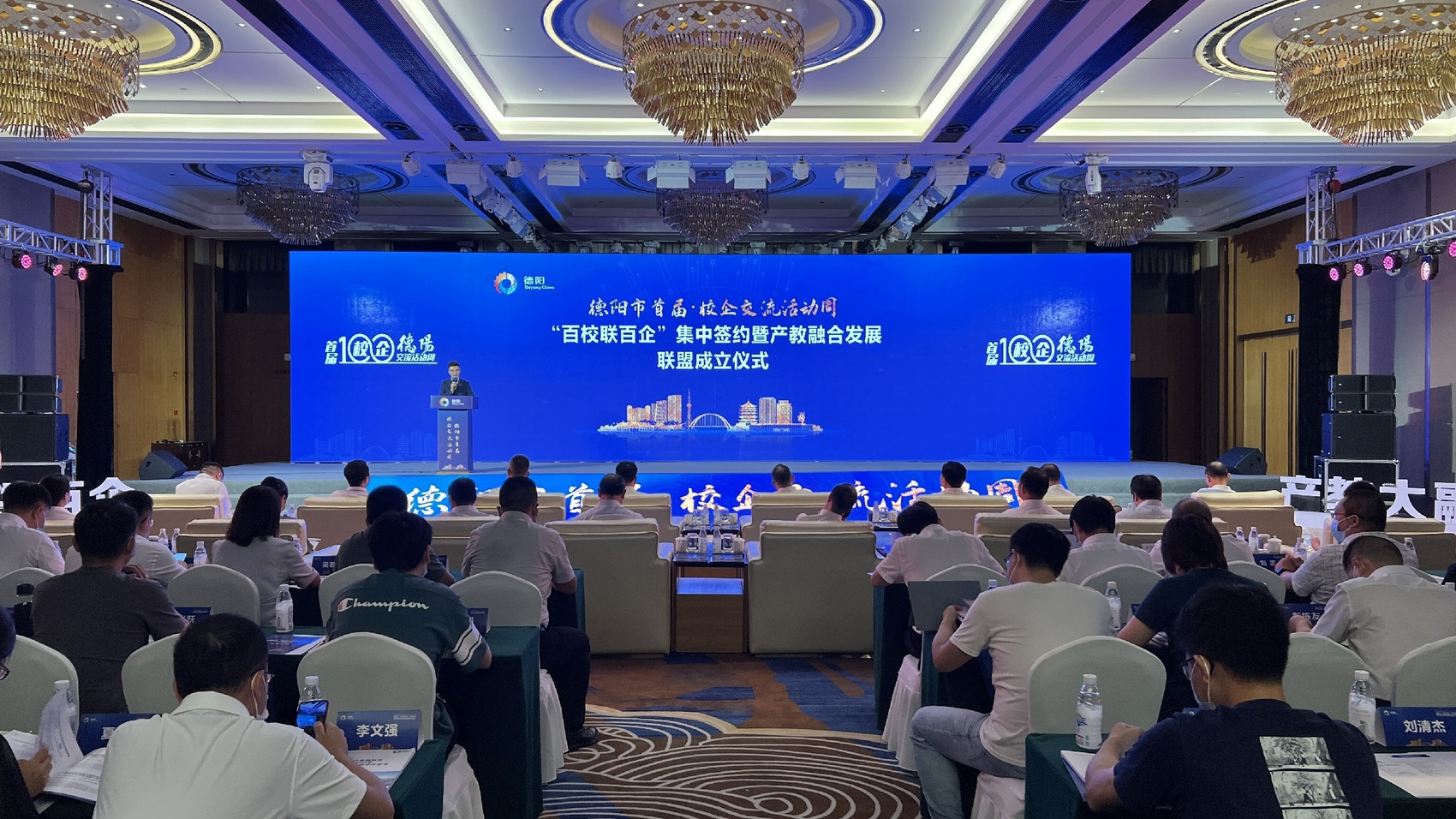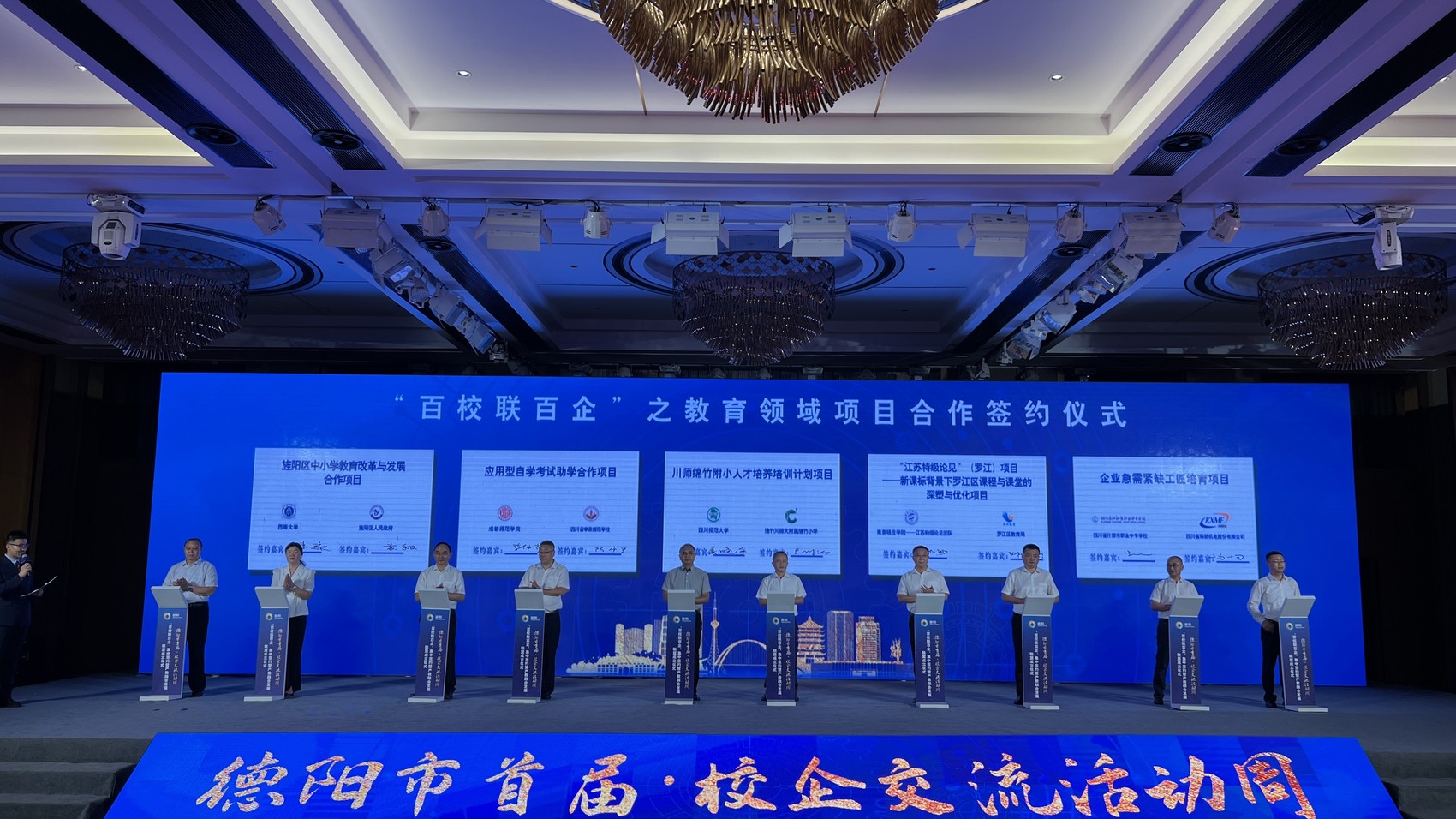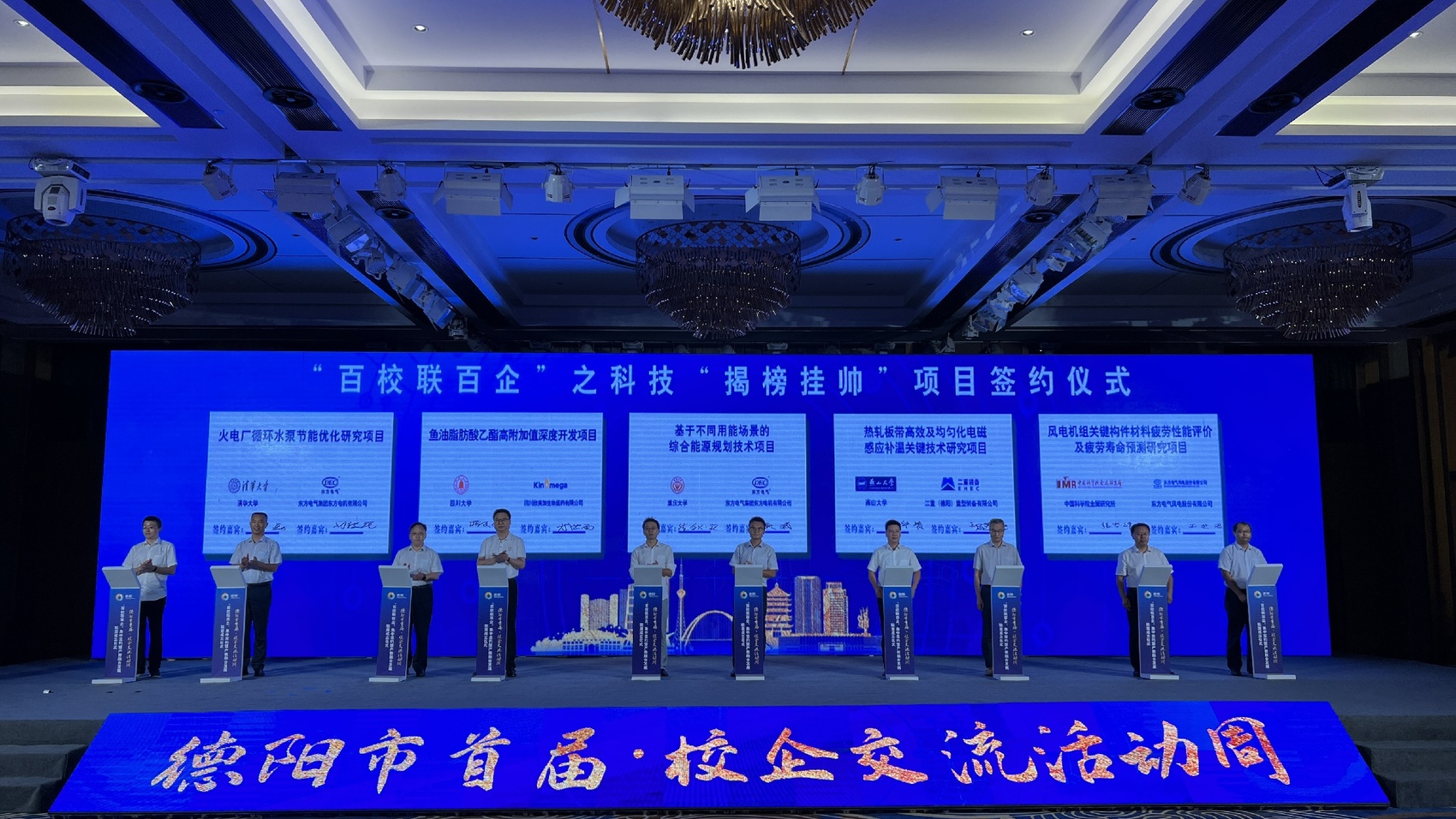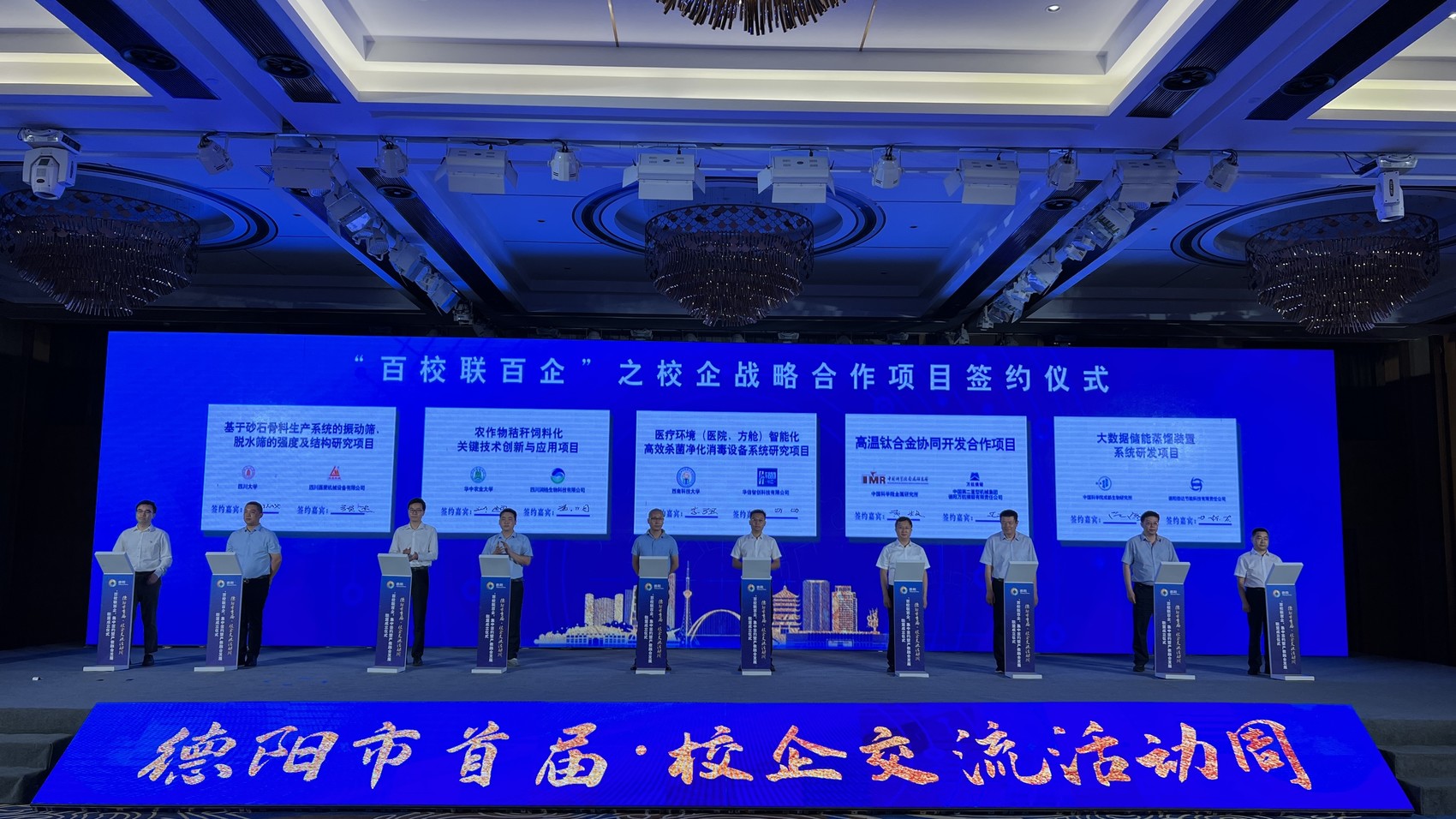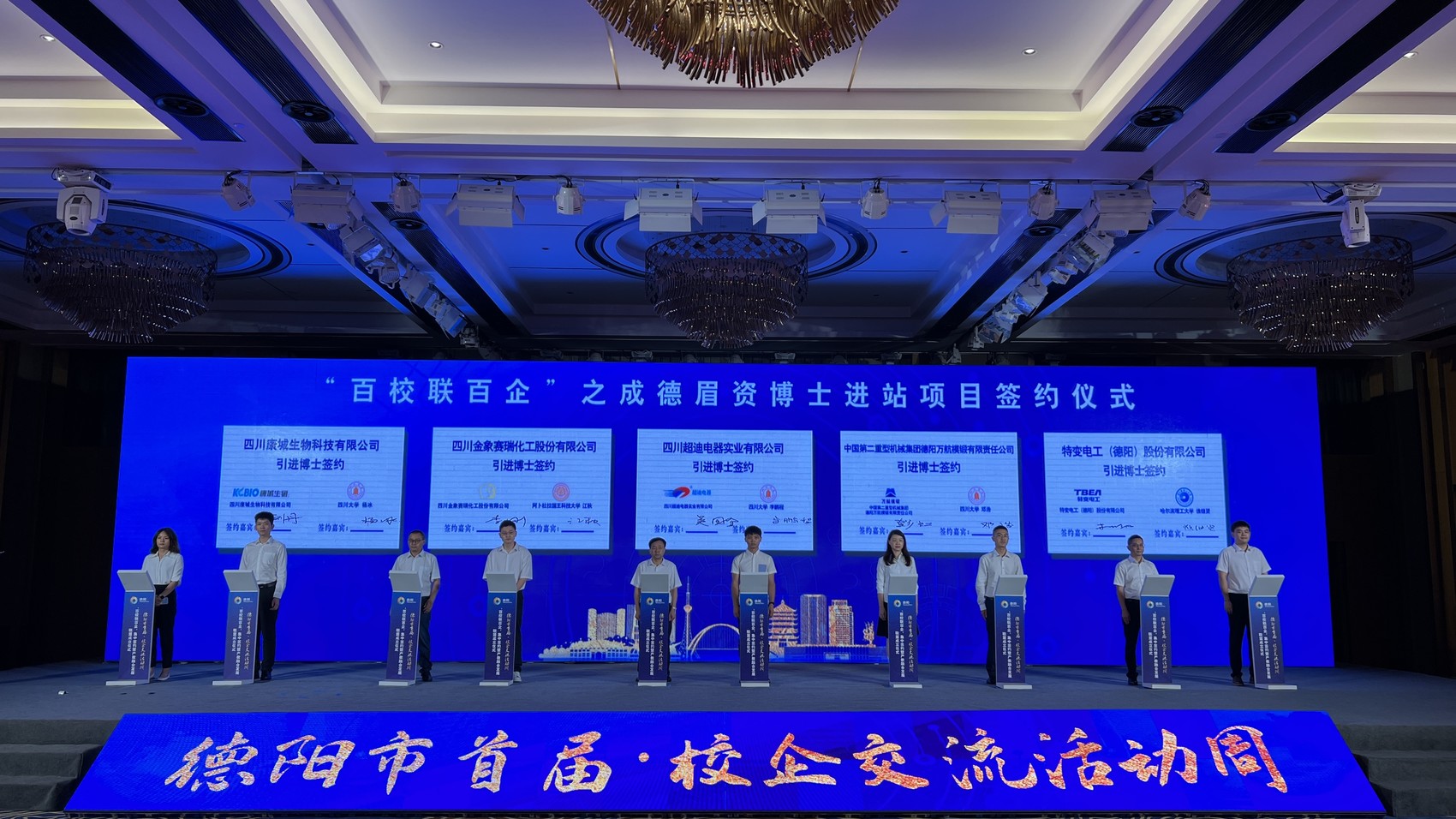 8月23日,德阳市首届·校企交流活动周“百校联百企”集中签约暨产教融合发展联盟成立仪式顺利召开。此次活动,是德阳市委深入落实中央、四川省委人才工作会议部署,持续深化校院企地合作、组团式开展产业技术创新、助推高质量发展的务实行动。活动由中共德阳市委、德阳市人民政府主办,市委组织部、市人社局、市科技局、市教育局、市经信局联合承办,活动周将通过知名高校德阳行、成德眉资博士人才交流、科技“揭榜挂帅”“未来校长”治校方略路演等多项分场活动广泛与高校、科研院所碰撞出智慧火花,结出丰硕的合作“果实”。