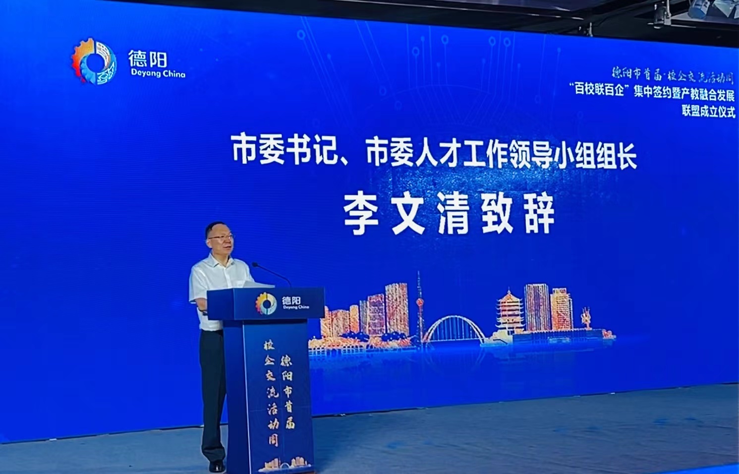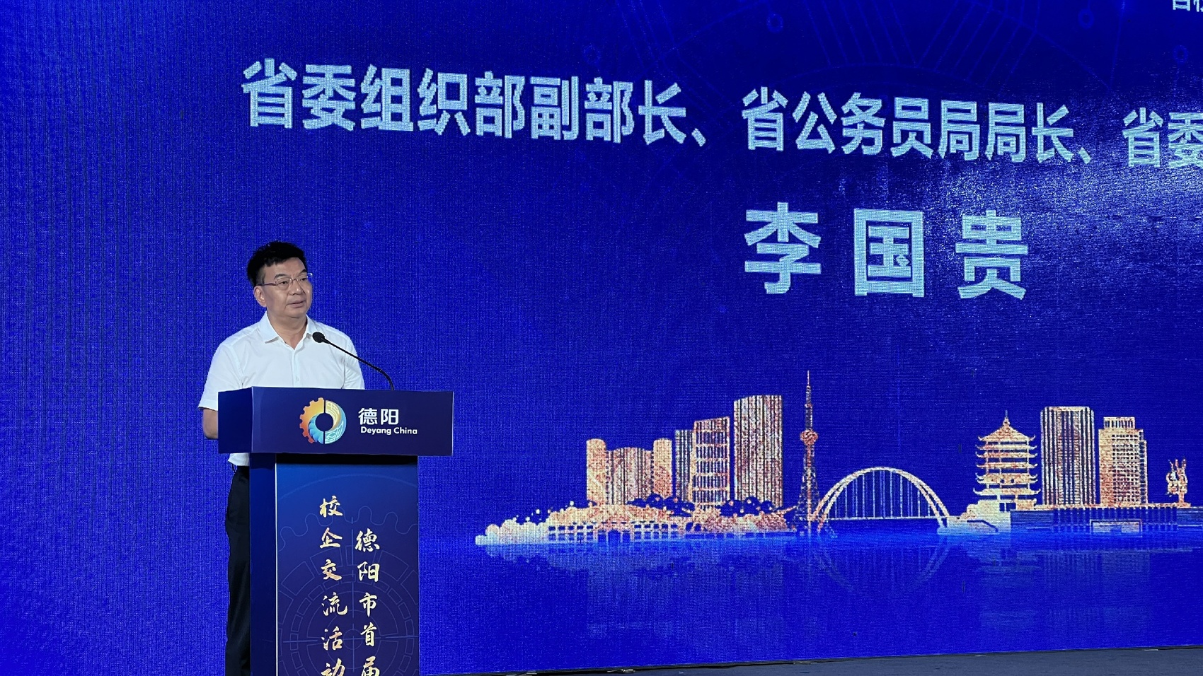 德阳市委书记、市委人才工作领导小组组长李文清致辞,他说,当前,“一带一路”建设、长江经济带发展、新时代西部大开发、成渝地区双城经济圈建设、成德眉资同城化发展等一系列国省重大战略在德阳交汇叠加,德阳正锚定“重返前三”目标,全力以赴拼经济搞建设,加快推动经济社会高质量发展。我们殷切希望,省内外各高校院所将科技、人才、学科优势与德阳发展定位、产业需求精准对接,进一步深挖多样合作潜力、拓宽合作空间领域,实现校地校企资源共享、互惠双赢;我们大力支持,行业龙头企业牵头建立产业创新联合体,向高校院所借智借力,积极开展技术研发、人才培养、成果转化等合作,培育发展新优势;我们真诚期盼,各位专家人才更多关注德阳、走进德阳,亲身感受德阳创新创业活力和十足诚意,携手共创美好未来。