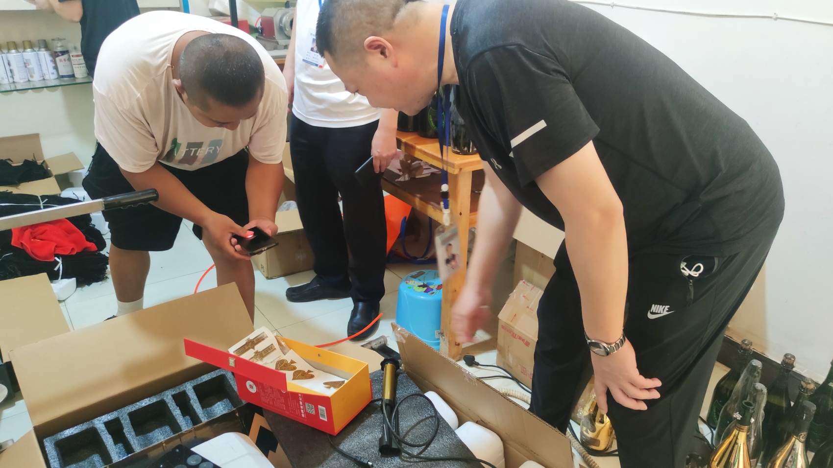 同一时段,担负截获待运商品任务的执法人员到达了另一村镇的快递点位,发现已封装且标明易碎物品的包裹两件。在崇州市市场监管局、崇州市公安局执法人员监督下,快递工作人员现场开封,发现12瓶与违法生产窝点一致的香槟酒。