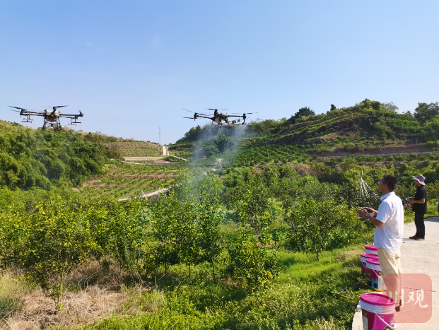 “嗖嗖嗖”,在殷向国和谢敏昌的遥控指挥下,两架无人机腾空而起,在柑橘园里来回穿梭,喷洒药液,整个过程快捷高效。