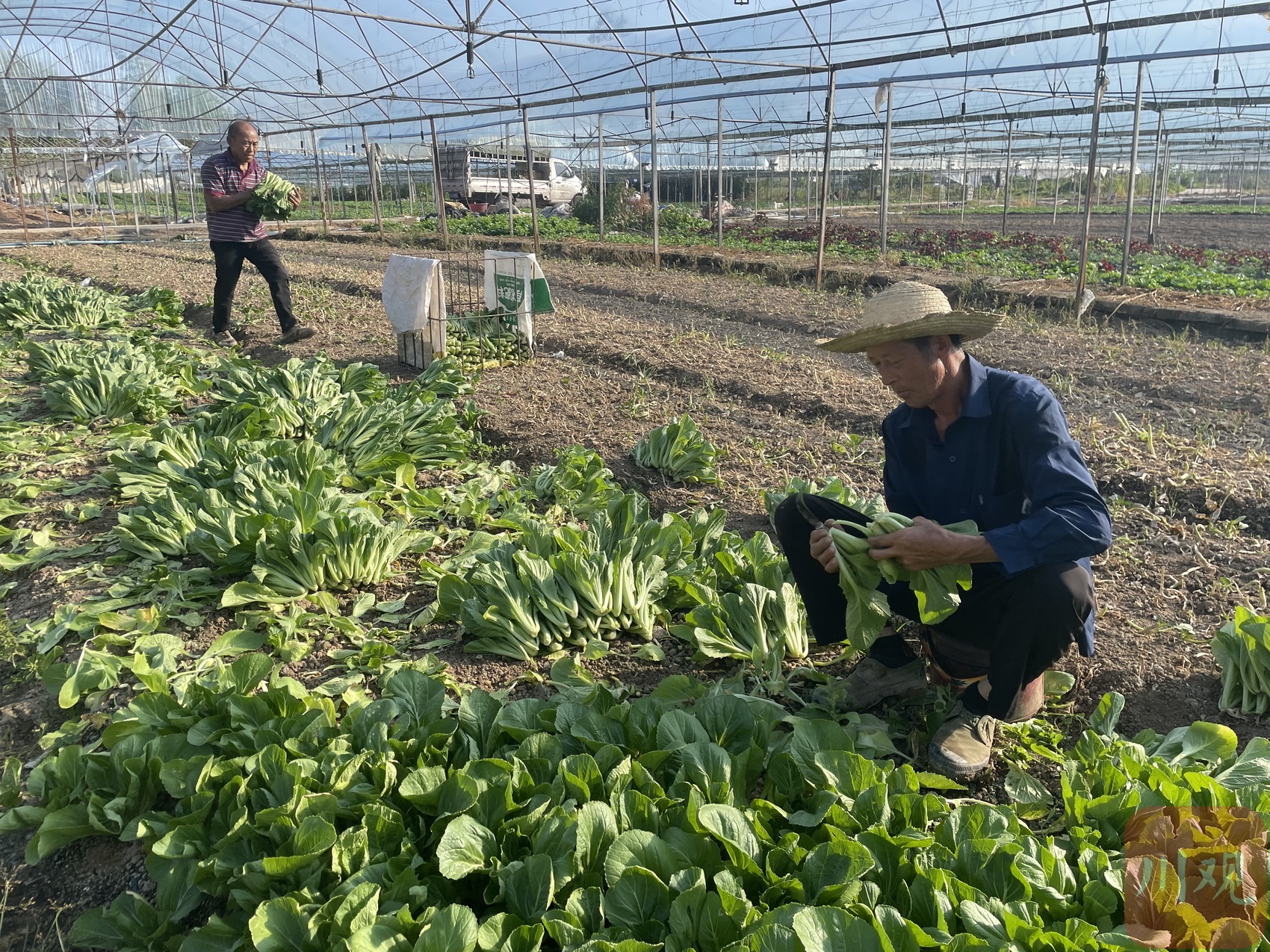 时间来到8时许,记者随李建平乘车前往蔬菜基地各处察看天志种植专合社应对高温干旱的成果。沿途四侧均掀起薄膜的大棚里,各类蔬菜披着绿装,黄瓜、豇豆、小白菜等新鲜采摘的蔬菜成筐堆放在路边,“一会儿它们将被送往城里好一新复兴批发市场。”李建平说。