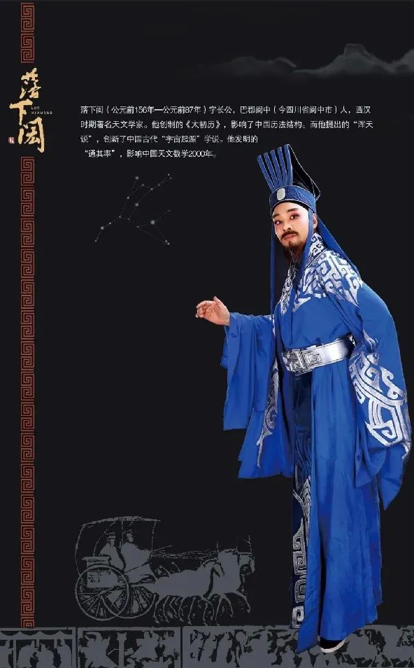 落下闳(公元前156年-公元前87年),复姓落下,名闳,字长公,巴郡阆中(今四川阆中)人。中国古代西汉时期的天文学家,曾制造观测星象的浑天仪,是太初历的主要创立者和浑天说的创始人之一,在历法上确定了春节,也被老百姓亲切地称为“春节老人”。其在家乡阆中蟠龙山建立了我国最早的民间观星台,改制了观测仪器浑仪,近代天文学史家朱文鑫说:“自汉落下闳作浑天仪,始立仪象之权舆”,后来的天文历法家如贾逵、张衡、祖冲之等人,则是在落下闳的基础上加以改进和发展的。落下闳完善了古代天文学说浑天说,奠定了我国古代先进的宇宙结构理论基础。他在天文学上的贡献,承前启后,对于推动中国天文学的发展,起到了重要作用。