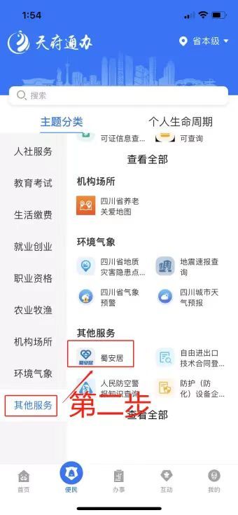 ——首先,下载安装。用户首先通过手机下载安装“天府通办”APP,打开天府通办APP后点击底部导航中的“便民”进入页面,然后在左侧的主题分类中选择“其他服务”,点击对应右侧内容中的“蜀安居”,即可进入四川住房保障公共门户移动端的首页。