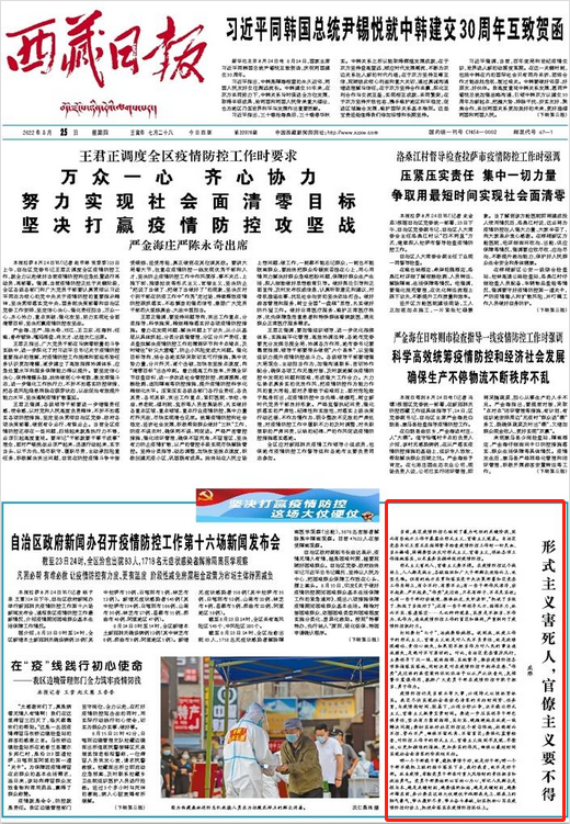值得注意的是,8月25日-27日,西藏日报连续三天在头版发表重磅评论文章,对疫情防控中暴露出的形式主义、官僚主义现象予以揭批。