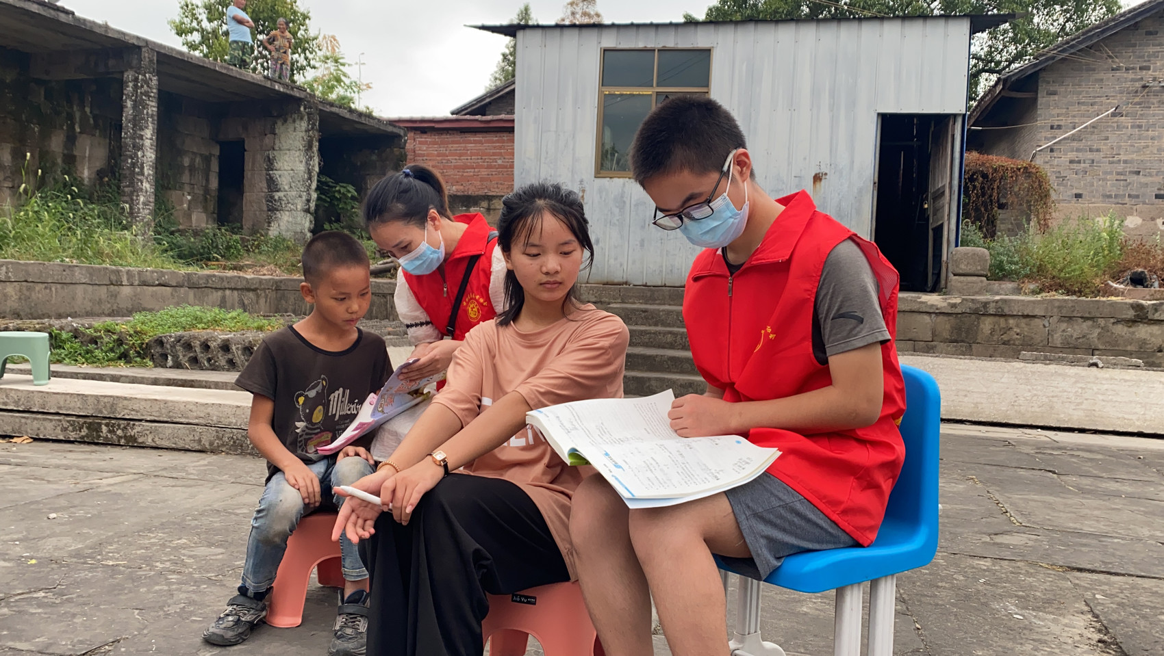 “相玲妈妈来啦!”车辆还没停稳,家中四姐弟就跑出来迎接。志愿者将书包、鞋子等物品拿下车后,大女儿小海便亲昵地挎起李相玲的胳膊往家里走。来到家中,志愿者们熟练地进屋搬出板凳,为兰家夫妻剪头发、唠家常。四姐弟也拿出暑假作业给志愿者们检查……