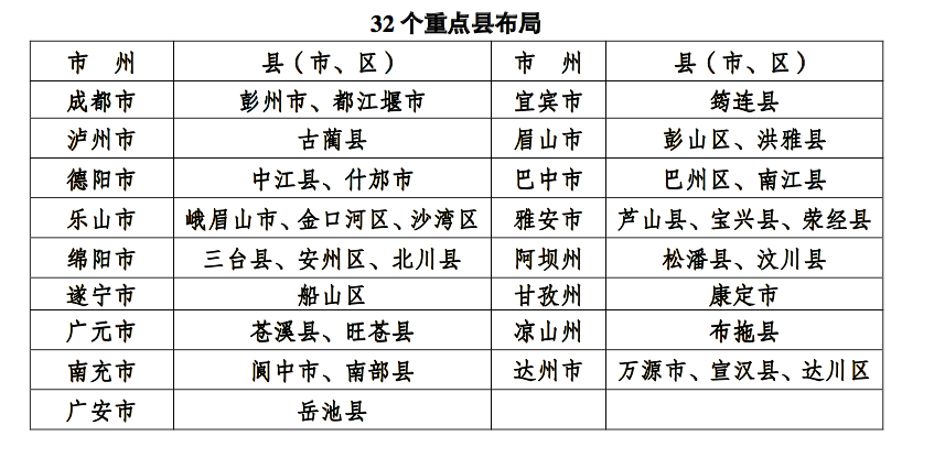 根据《推进方案》,下一步我省将优化产业布局,将中药材产区划分为四个区划,分别是:四川盆地药材生产区、盆地边缘山地药材生产区、川西高原及川西高山峡谷药材生产区和攀西地区药材生产区,建设彭州市、三台县、中江县等中药材产业重点县 32 个,打造川芎、川丹参等 24 个中药材品种,重点打造一批道地药材。