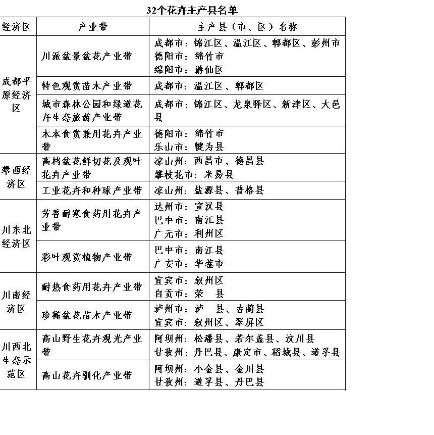 在花卉产业布局方面,根据资源特色和发展优势,将种植规模较大、加工和服务业较为发达的32个县(市、区)作为花卉主产县,作为推进花卉产业高质量发展的主战场,培育形成“五区十二带”花卉产业布局。