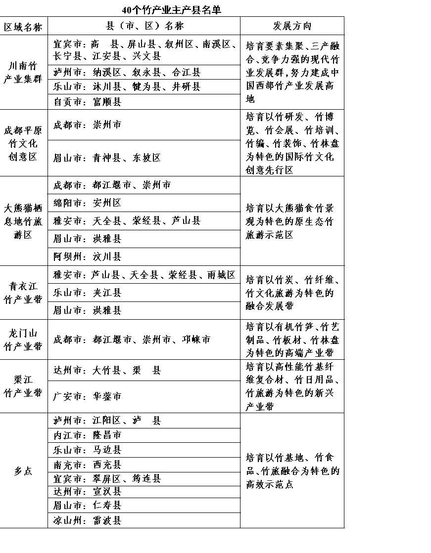 具体而言,在竹产业布局方面,根据我省竹资源分布区的自然、经济、社会状况,将竹林面积较大(5万亩以上)、有一定加工基础或竹文旅融合较好的40个县(市、区)作为竹产业主产县,作为推进竹产业高质量发展的主阵地,全面延伸竹产业链,提升竹林基地培育及加工利用水平,加快形成“一群两区三带多点”的格局。