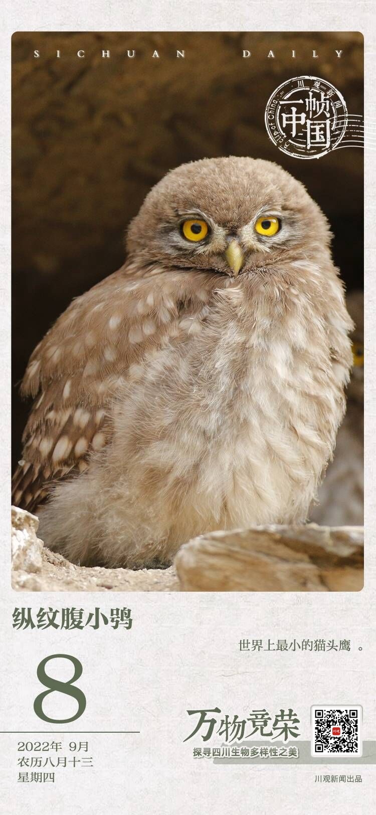 鸮(音xiāo),就是猫头鹰。大大的眼睛、圆圆的脸盘,拥有猫一样耳朵的夜间精灵——这或许是大多数人印象中的猫头鹰。但有一种猫头鹰却十分的小巧玲珑,它就是纵纹腹小鸮。