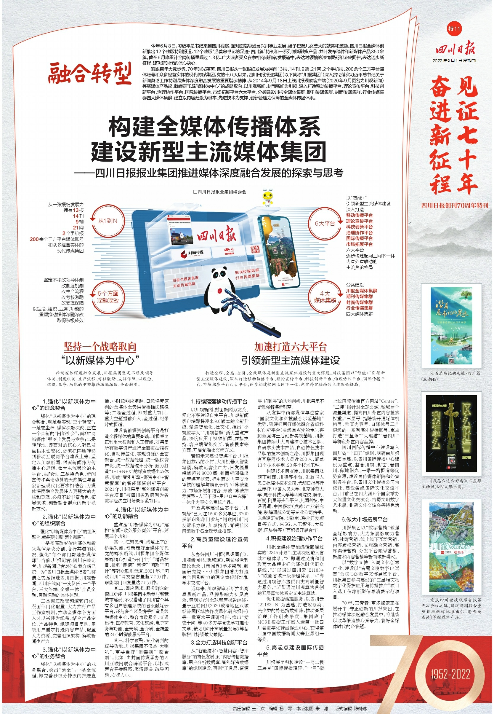 紧跟百年大党步伐,70年时光荏苒,四川日报从一张报纸发展为拥有13报、14刊、9端、21网、2个手机报、200余个三方平台媒体账号和众多经营实体的现代传媒集团。党的十八大以来,四川日报报业集团(以下简称“川报集团”)深入贯彻落实习近平总书记关于新闻舆论工作特别是媒体深度融合发展的重要指示精神,从2014年9月18日上线川报观察客户端(2020年9月更名为川观新闻)等新媒体产品起,就锁定“以新媒体为中心”的战略取向,以川观新闻、封面新闻为引领,深入打造移动传播平台、理论宣传平台、科技创新平台、治理协作平台、国际传播平台、市场拓展平台六大平台,分类建设川报全媒体集群、期刊传媒集群、封面传媒集群、行业传媒集群四大媒体集群,建立以内容建设为根本、先进技术为支撑、创新管理为保障的全媒体传播体系。