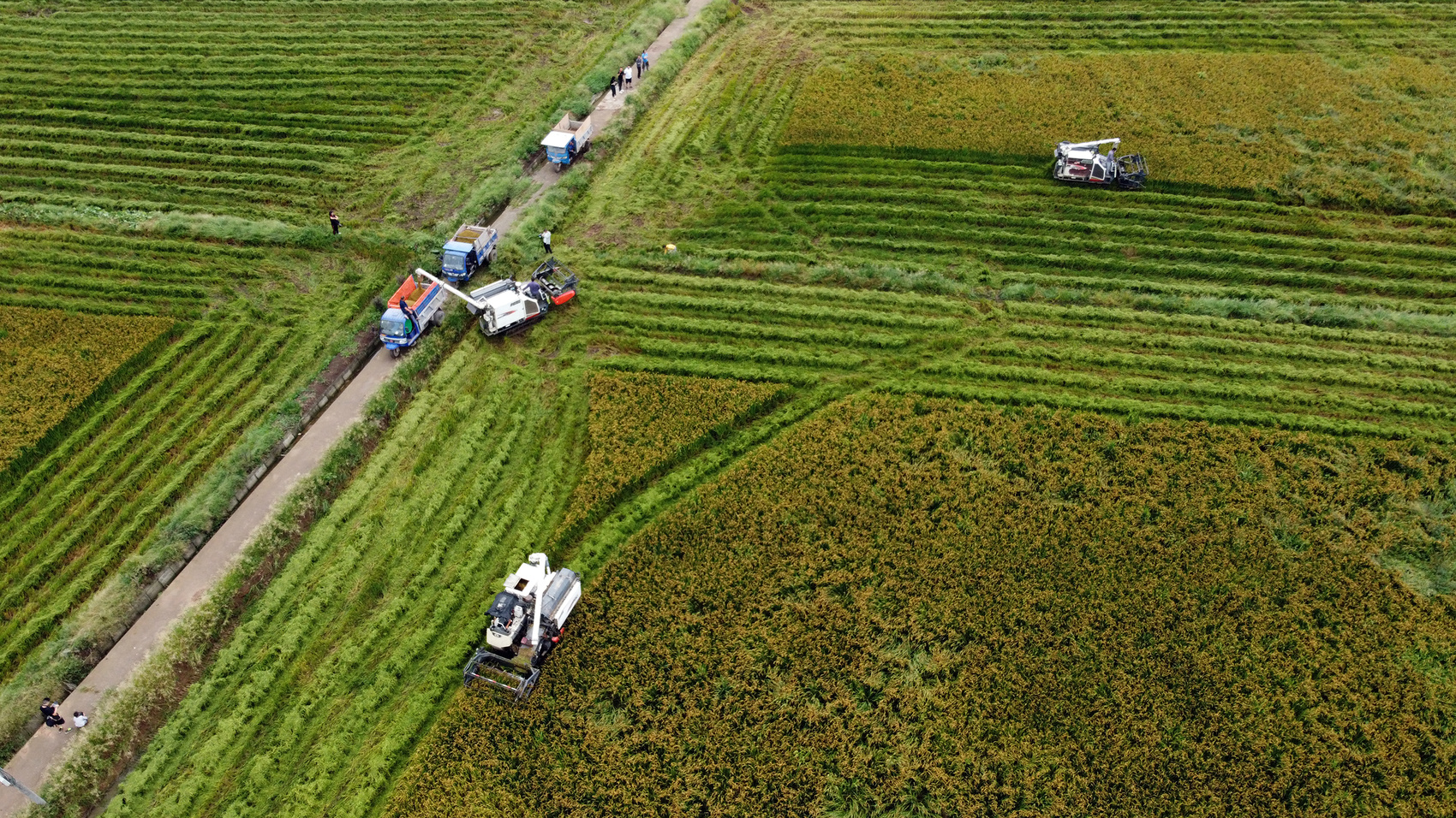 “今天我们开始集中收割,未来20天确保颗粒归仓,预计整个基地可收获稻谷700吨。”8月31日,位于丹棱县仁美镇雄义村、高河村和里仁社区的1600亩退园还耕示范基地正式开镰收割。当天一大早,7台水稻收割机的马达轰鸣声便在基地里回荡,每台收割机以每小时5亩的速度快速收割,一辆辆装满稻谷的拖拉机在田埂上来回穿梭。基地角落里,负责人黎可学的电话不断。他正忙着协调收割、烘干稻谷、生物肥还田以及后续售卖大米的各项事情。