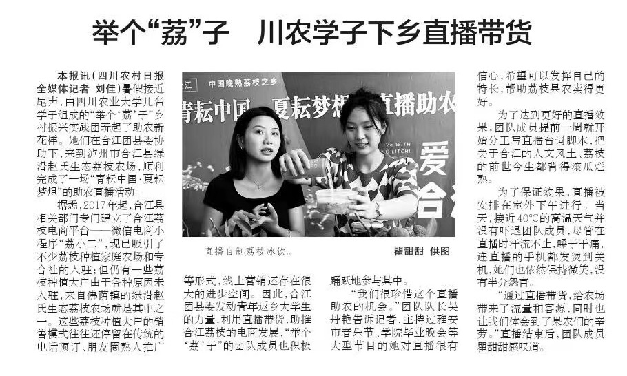 暑假接近尾声,由四川农业大学几名学子组成的“举个‘荔’子”乡村振兴实践团玩起了助农新花样。她们在合江团县委协助下,来到泸州市合江县绿沿赵氏生态荔枝农场,顺利完成了一场“青耘中国·夏耘梦想”的助农直播活动。