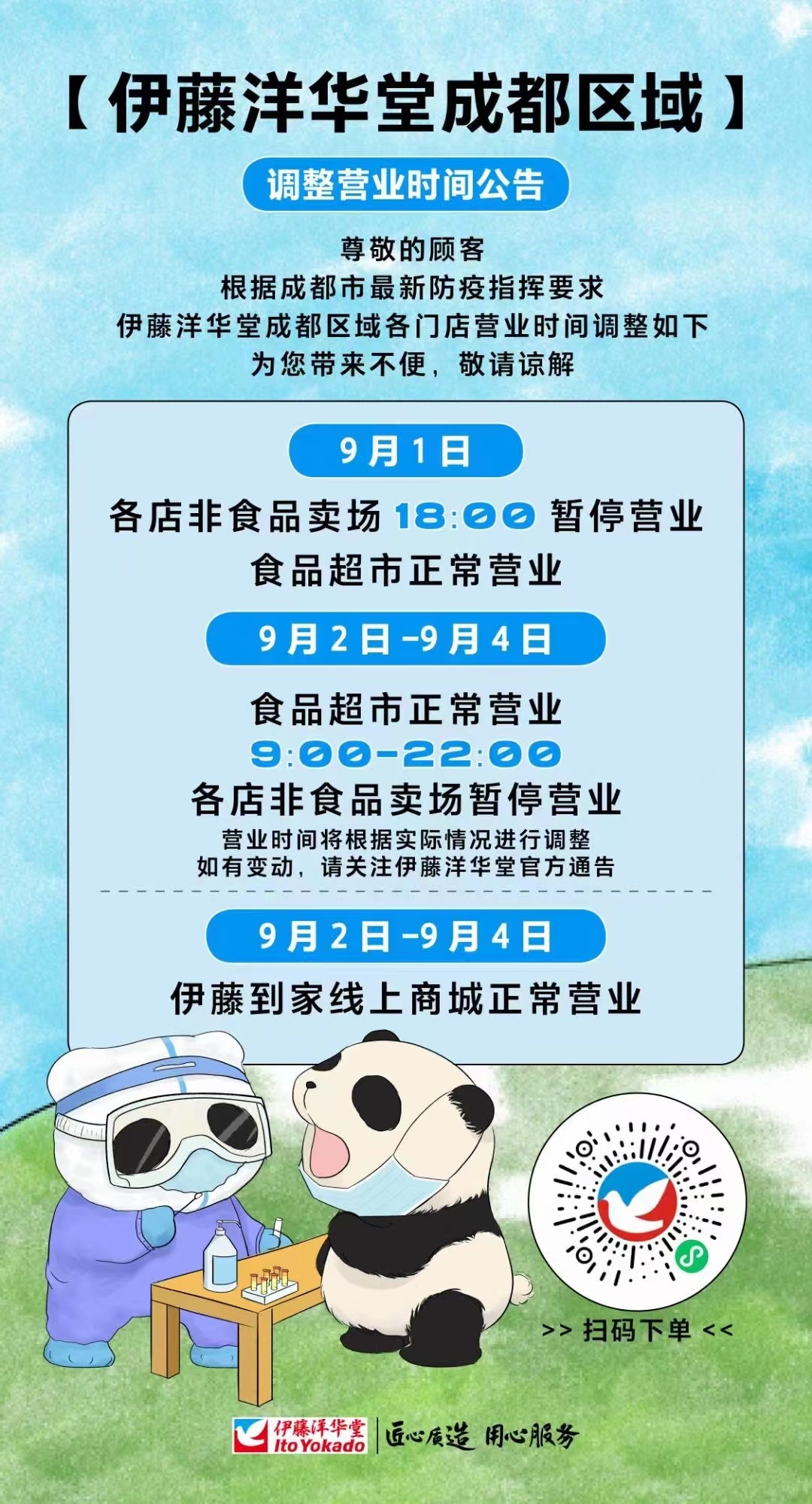 成都伊藤洋华堂市域内9家门店自9月1日18:00起,除食品超市外区域暂停营业,食品超市正常营业,营业时间调整为9:00-22:00。即日起至4日期间,伊藤线上业务正常运转。部分居家生活必需品移至食品超市外,方便顾客选购。据介绍,成都伊藤目前确保生活必需品30天储备粮,持续供货、稳价。