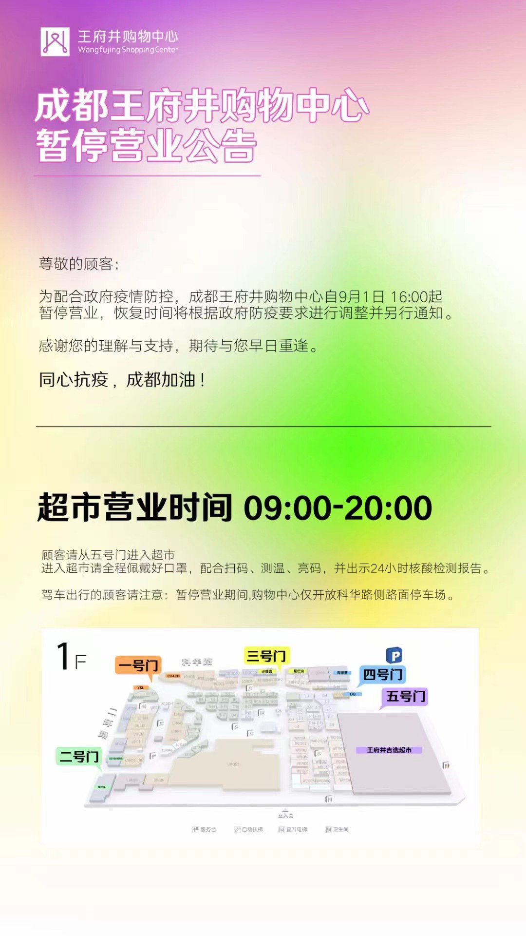 成都王府井购物中心自9月1日16:00起暂停营业,超市正常营业,营业时间为9:00-20:00。该商场提示,顾客请从五号门进入超市,暂停营业期间,购物中心仅开放科华路侧路面停车。