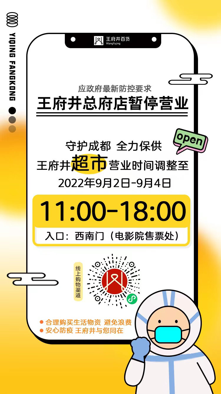 成都王府井总府店自9月1日17:00暂停营业。闭店期间,王府井总府店超市9月2日-4日营业时间调整至11:00-18:00,进入超市请佩戴口罩,配合扫码、亮码、测体温,并出示24小时核酸阴性证明。