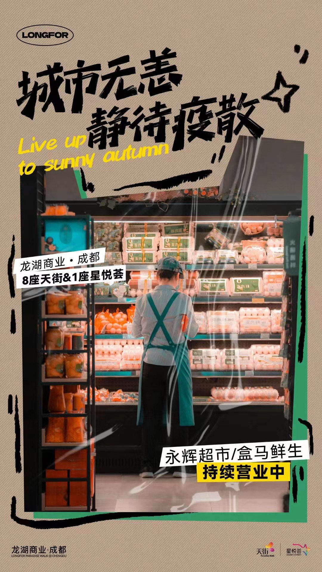 龙湖商业位于成都的8座天街及1座星悦荟均保持超市业态持续营业,永辉超市、盒马鲜生均为正常营业,麻辣空间清油火锅、烤匠麻辣烤鱼、悦百味、Wagas等部分餐饮提供外送服务。