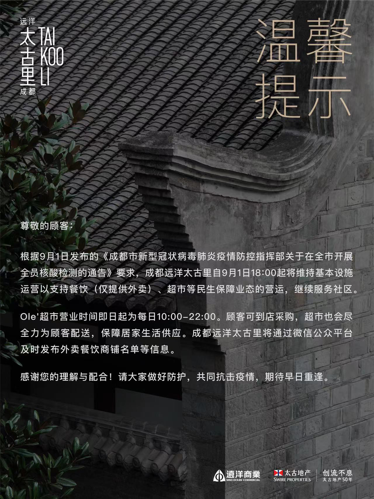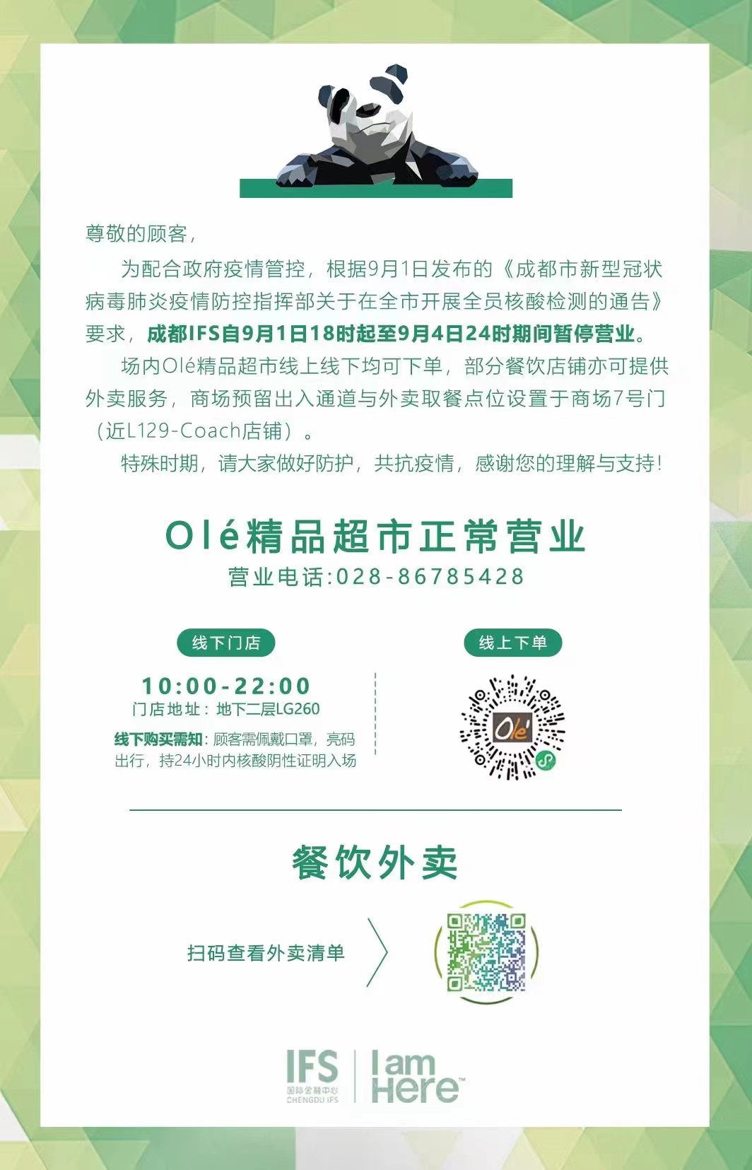 自9月1日18:00起维持基本设施运营,以支持餐饮(仅提供外卖)、超市等民生保障业态的营运。Olé精品超市营业即日起为每日10:00-22:00。顾客可到店采购,超市也会尽全力为顾客配送。