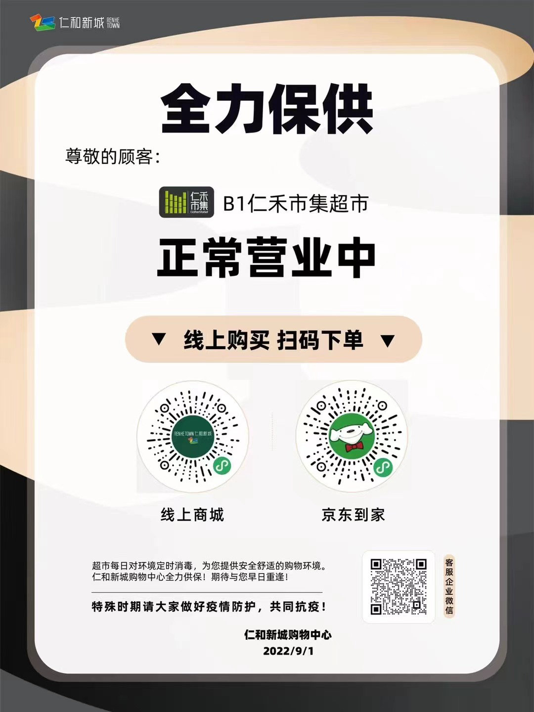 仁和新城购物中心全力保供,仁禾市集超市正常营业,同时可以通过线上商城和京东到家在线上购买下单。此外场内全楼层餐饮支持外卖配送,涵盖内容较为丰富,包括麦当劳、良品铺子、茶百道、园里火锅、wehouse、大海湾、明婷小馆、竹涟烧肉、许家艺创菜、叔叔的家私房菜等不同特色的餐饮商家。