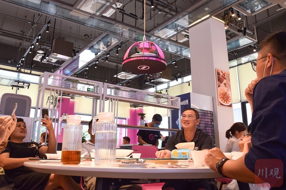 记者选择在大厅就餐,头顶不时传来的嗡嗡声,提醒大家又有菜品到了——天花板上是一道道云轨,透过玻璃,能看到一台台圆盘样的运菜机器人在跑来跑去。到了目的地餐桌,由一根绳索牵引着餐盘降落到餐桌上方,这就是餐厅名字“从天而降”的由来。