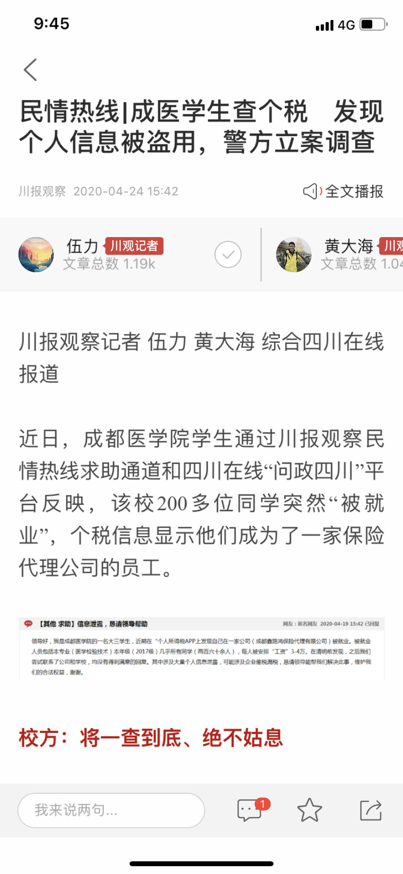 2020年4月3日,成都某学院在校大学生黄某登陆“个税所得税”APP,发现其被成都某保险代理有限公司申报保险代理人(即保险营销员)佣金。后经学校统计,该校268名在校大学生信息被该保险代理公司盗取,并在“个人所得税”APP中登记申报保险代理人佣金,申报佣金总额达960余万元。案发后,省、市、区三级网安部门高度重视,新都区公安分局在上级指导下,第一时间立案侦查。