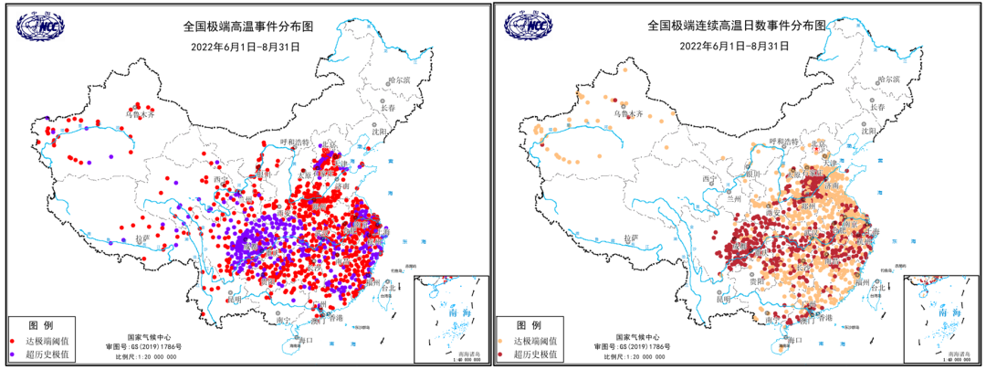 6月13日至8月30日,我国中东部地区出现了大范围持续高温天气过程。此次高温事件持续79天,为1961年以来我国区域性高温过程持续时间最长;35℃以上覆盖1692站(占全国总站数70%),为1961年以来历史第2多;37℃以上覆盖1445站(占全国总站数60%),为1961年以来最多;有361站(占全国总站数14.9%)日最高气温达到或超过历史极值,重庆北碚连续2天日最高气温达45℃。评估结果显示,此次高温事件综合强度为1961年有完整气象观测记录以来最强。
