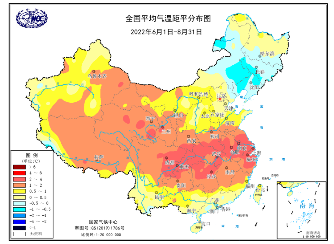 2022年夏季全国平均气温为1961年以来历史同期最高。夏季(6月1日至8月31日),全国平均气温22.3℃,较常年同期偏高1.1℃,为1961年有完整气象观测记录以来历史同期最高(图1)。全国大部地区气温较常年同期偏高0.5~2℃,华东中部、华中中部、西南地区东北部等地偏高2~4℃(图2)。湖南、浙江、江苏、湖北、安徽、江西、上海、四川、重庆、贵州、甘肃、陕西、河南、宁夏、青海、新疆、西藏17个省(区、市)平均气温均为历史最高,福建为第二高。全国平均高温日数14.3天,较常年同期偏多6.3天,为1961年以来历史同期最多。