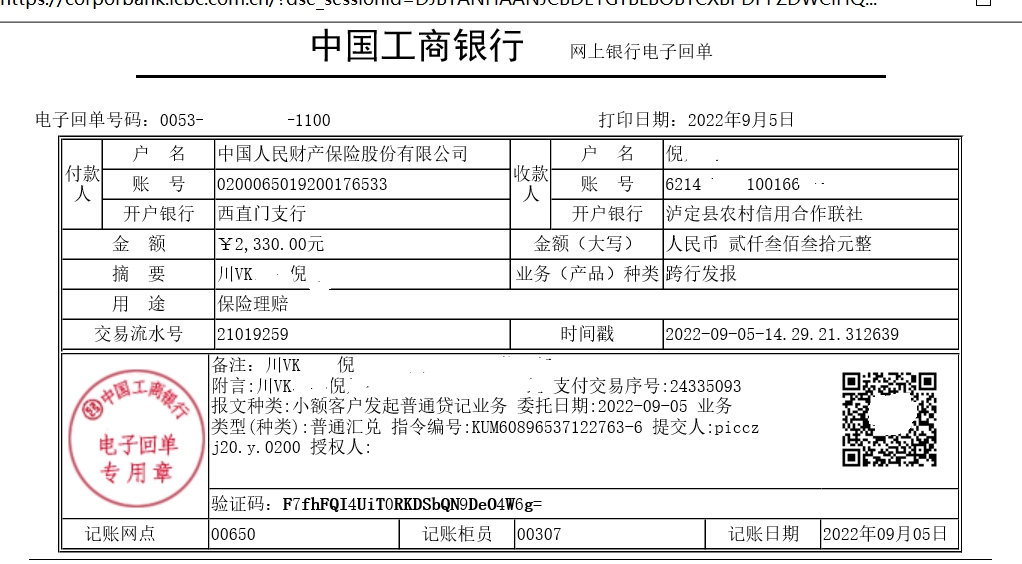 9月5日14时29分,人保财险向车主倪女士支付车险赔款2330元,这也是四川省财险行业支付泸定地震受灾群众的首笔赔款。